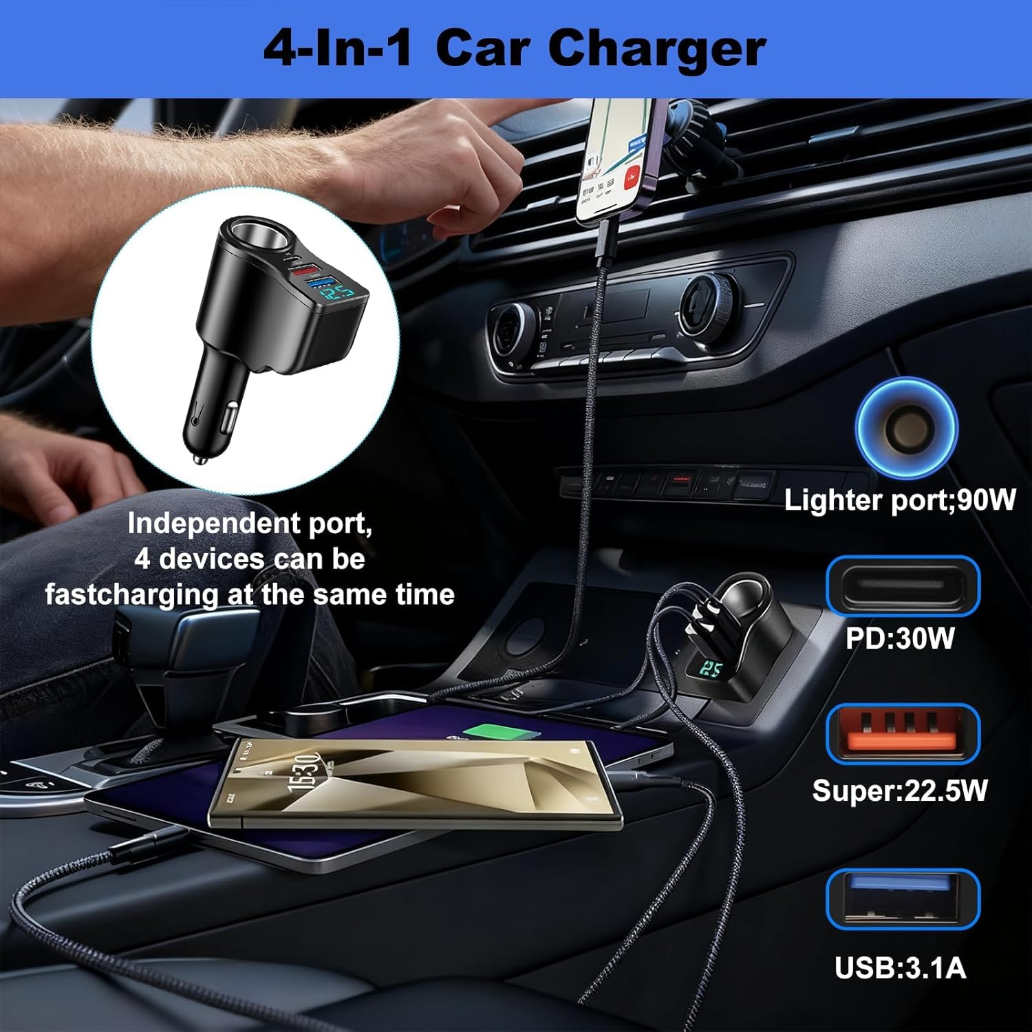 4 in 1 USB C Car Charger 106W, Cigarette Lighter Adapter with 90W Cigarette Lighter 66W 2 USB-A 30W 3.1A PD Fast Charging, Mini Cars Thief for iPhone Samsung GPS Table Android