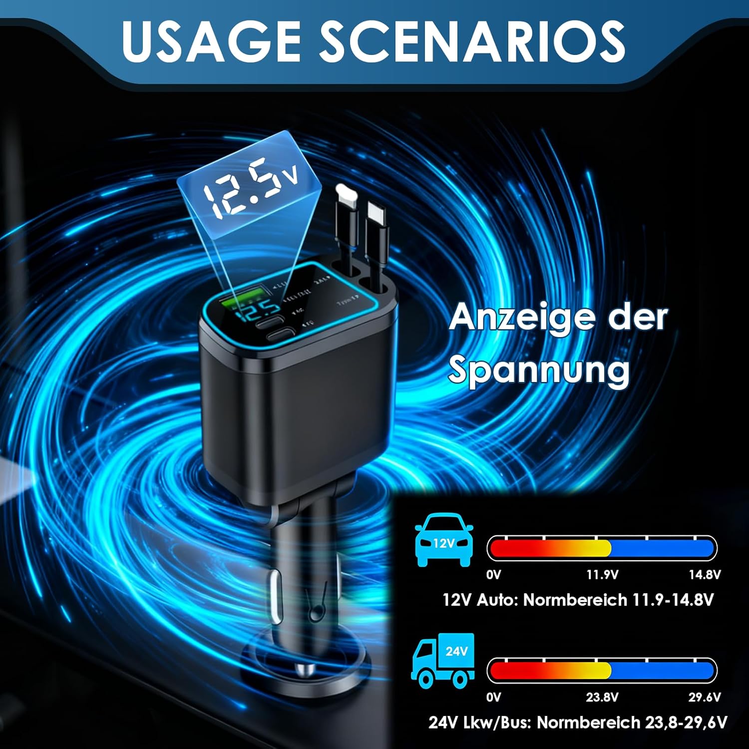 【COMPACT FORMAT】: With a size of 14.8 × 5.5 × 3.2 cm, this car charger is easy to install and use. Two retractable cables up to 65cm reduce clutter and allow flexible use in both front and rear seats. Convenient to keep the interior of the vehicle tidy while charging your phone.