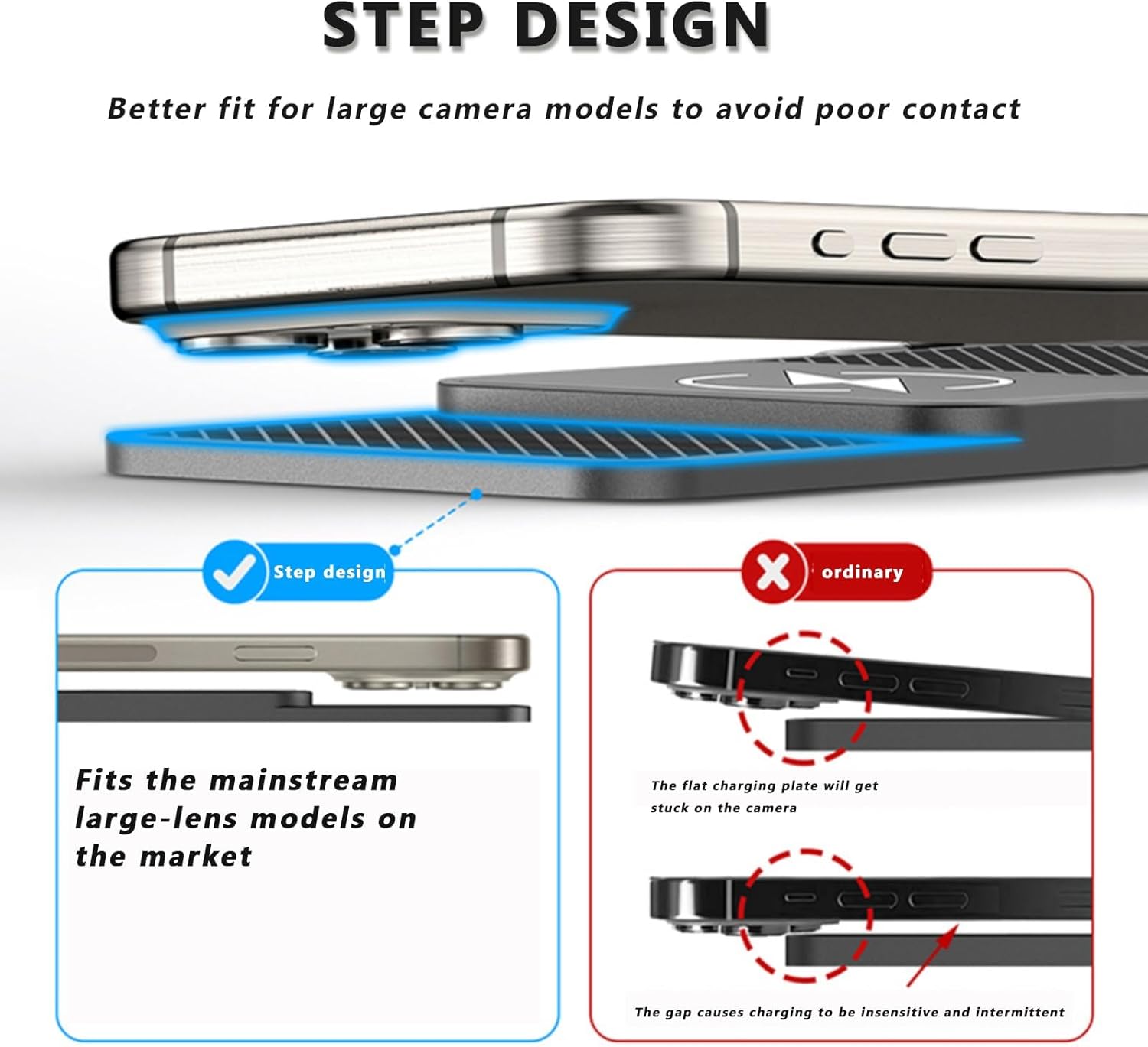 【Multifuncional】Compacta y ligera, esta base de carga se adapta perfectamente al salpicadero, la consola central o los reposabrazos. También es compatible con fundas de teléfono no metálicas de hasta 4 mm de grosor, sin necesidad de quitar la funda