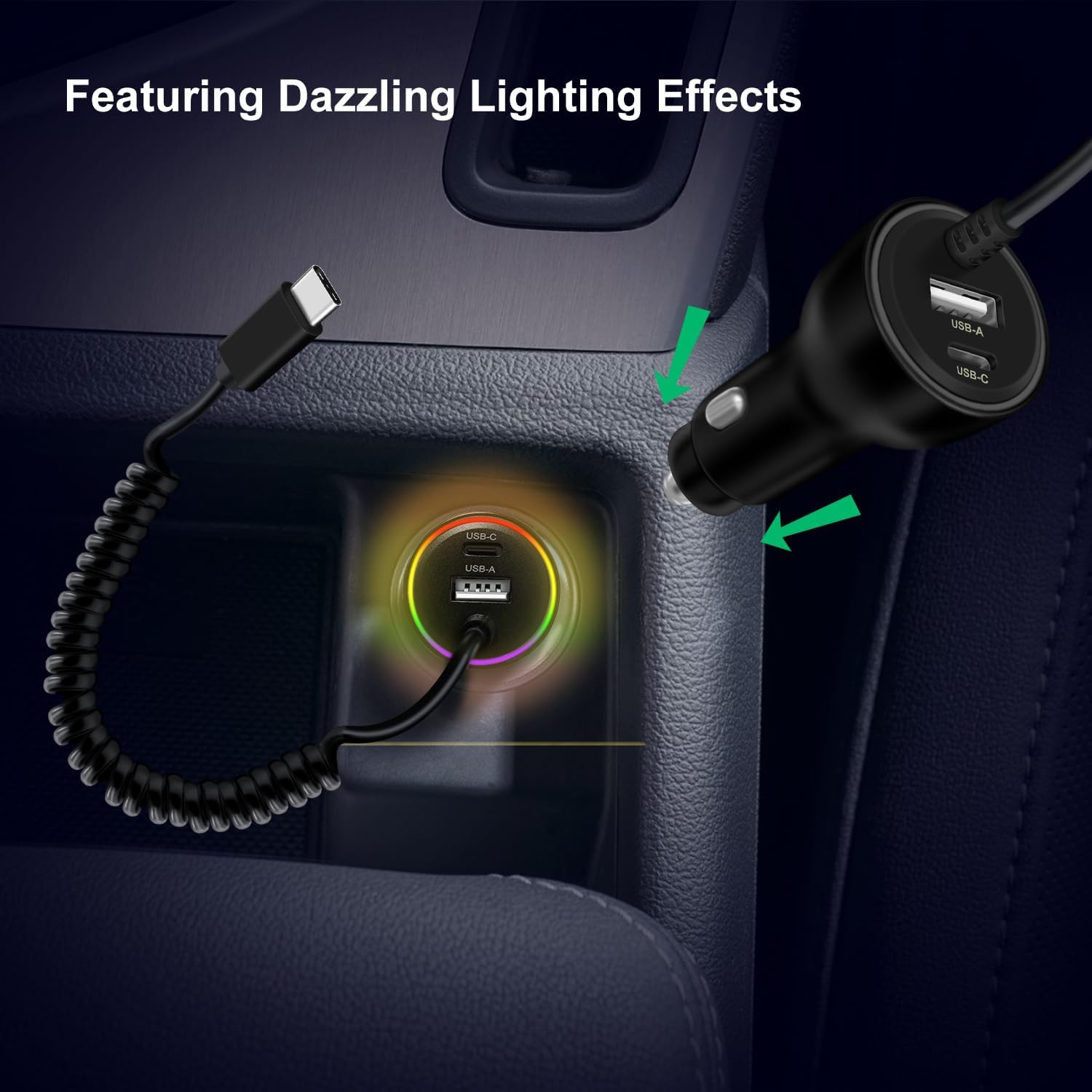 Dazzling LED Indicator: USB C car charger fast charging equipped with dazzling LED indicator, intuitively displays charging status through lighting, such as normal charging, fast charging start, abnormal reminder, etc