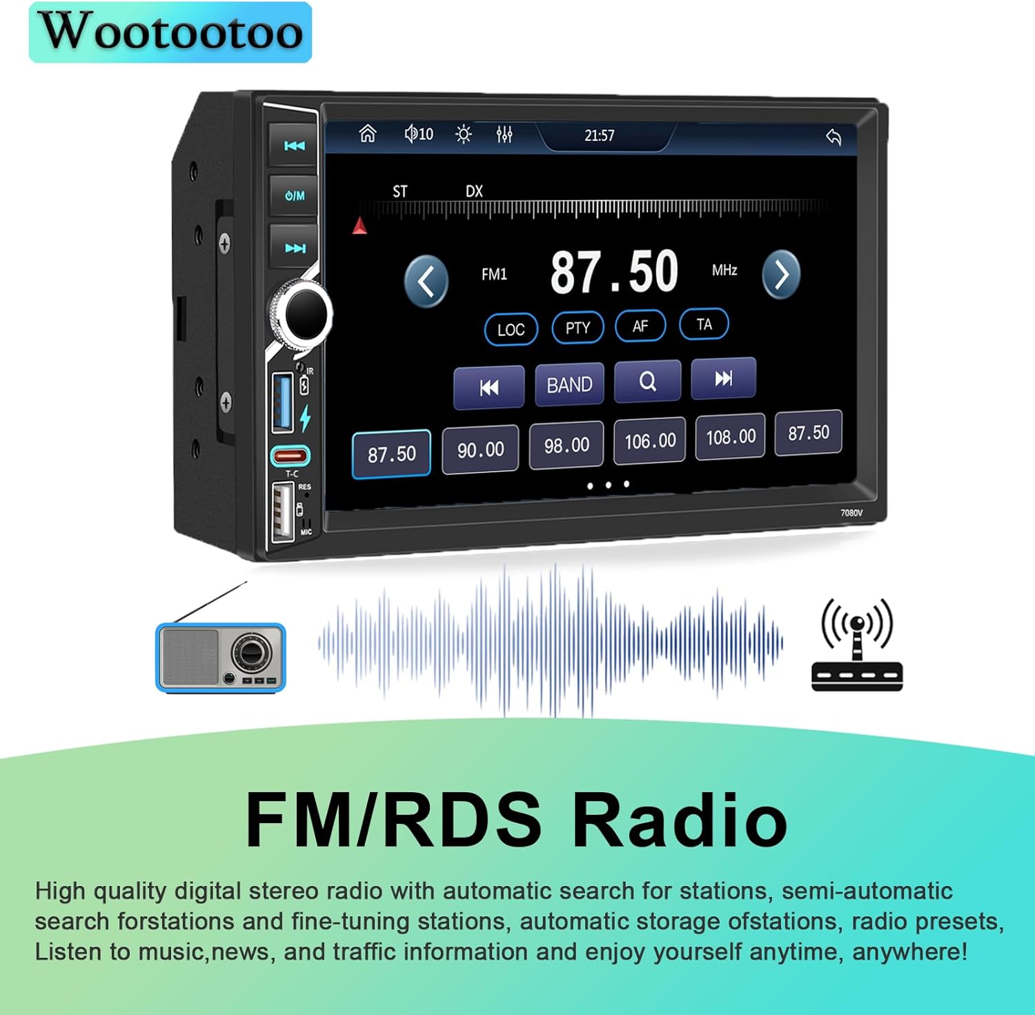 【2 Din Bluetooth Car Stereo】This BT car stereo with 2 din car radio seamlessly integrates with built-in Bluetooth for hands-free calling and playing BT music anytime, anywhere, the latest built-in smart chip, RDS car stereo allows you to listen to different radio stations and news, weather forecast to avoid traffic jams, such as traffic information