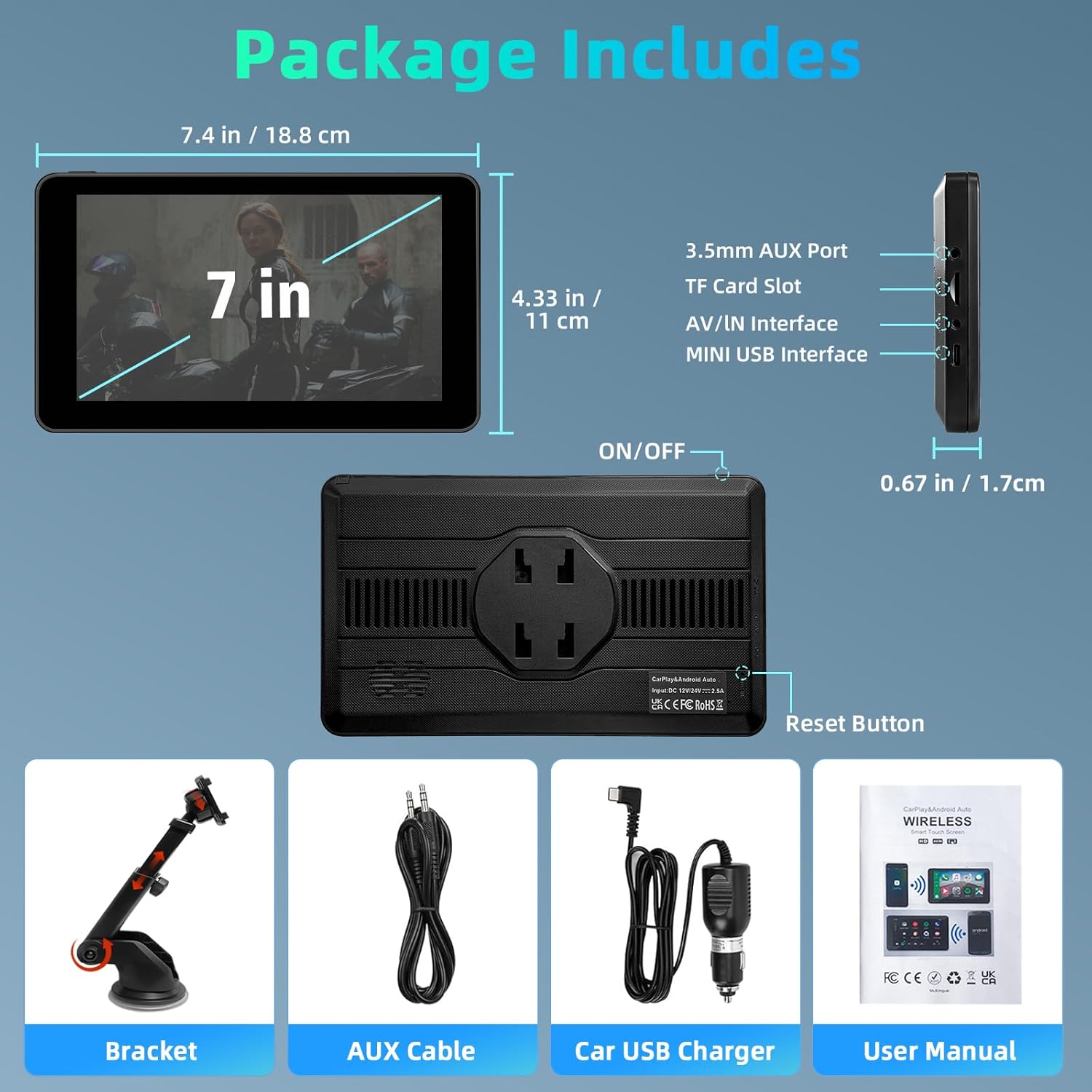 7 Inch Touch Screen for Car with Carplay Android Auto Wireless, Link Mirror, Navigation, Siri, FM, AUX, Bluetooth 5.2, Airplay, Video Reading, GPS Navigation