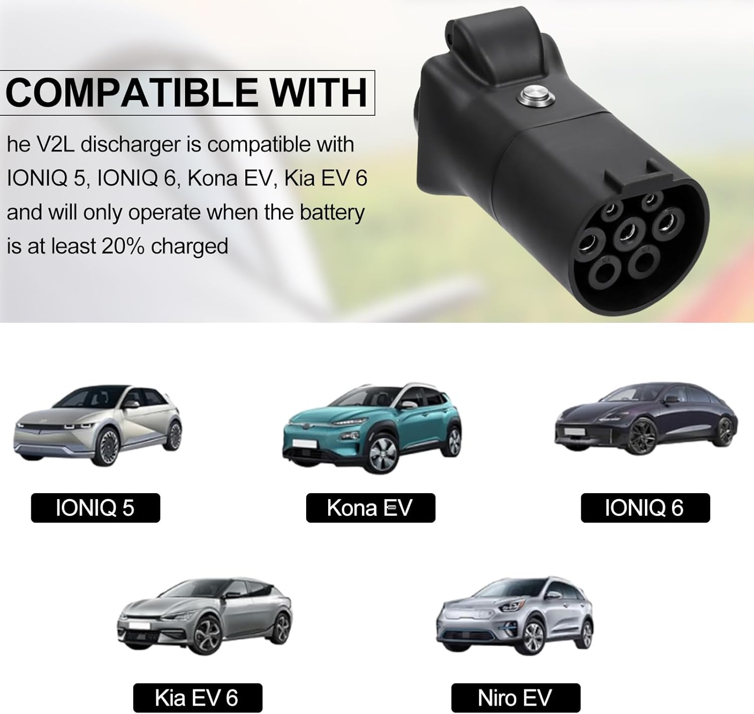 Lista de compatibilidad EV V2L: Compatible con Kia y Hyundai EV con función de descarga V2L: Descargador V2L Compatible con IONIQ 5, IONIQ 6, Kona EV, Kia EV 6 y solo puede funcionar cuando la batería está cargada al menos al 20%
