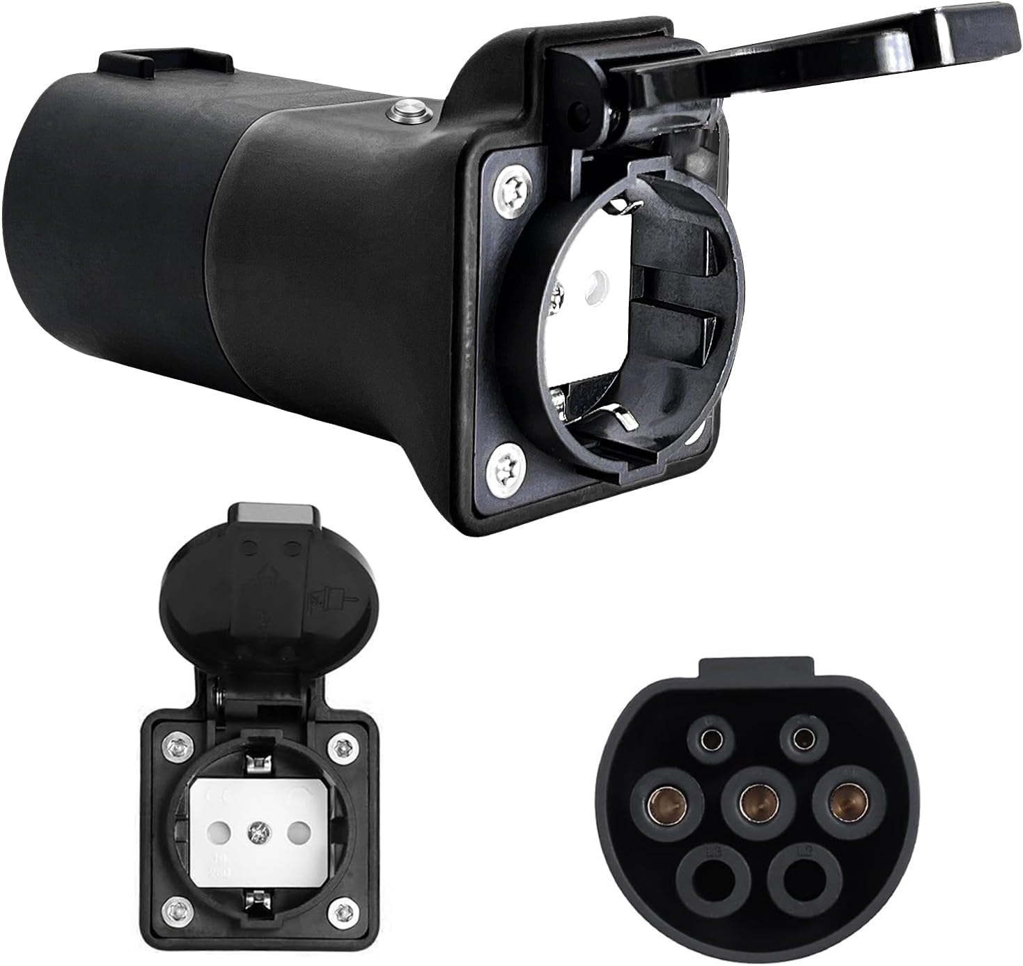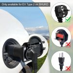 Adaptador de conversión de carga EV – Adaptador tipo 2 a Schuko – Este adaptador de descarga puede convertir el puerto de carga TIPO-2 de un vehículo eléctrico en un tomacorriente estándar europeo para alimentar otros dispositivos durante acampadas o actividades al aire libre, y también para alimentar otros vehículos eléctricos con energía insuficiente en caso de asistencia en carretera.