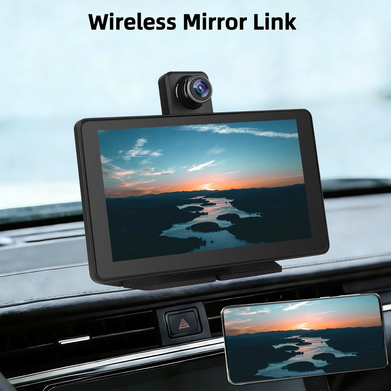 7″ Wireless Car Carplay Screen: This 7 inch car screen is touch and portable. Supports Wireless Car Play, Android Auto Wireless and Wireless Mirror Link. IMPORTANT: This device does not have built-in GPS; real-time navigation is done via Carplay, Android Auto or Mirror Link from your phone.