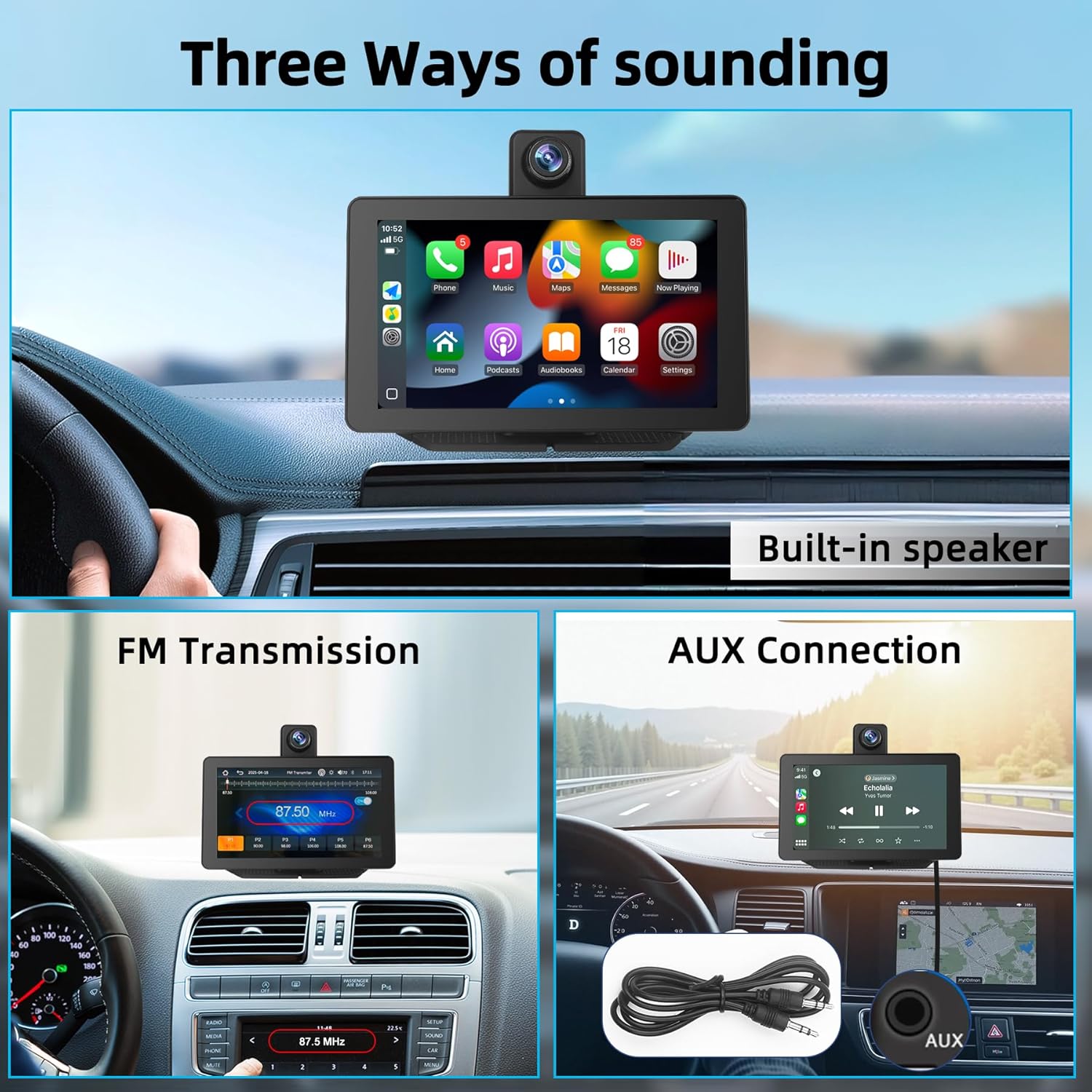 Car Screen 7 Inch Touch Screen with Carplay and Android Auto Wireless, Front Camera 1080P and No Installation – Portable Carplay Screen with Bluetooth | FM/AUX Transmitter for Cars