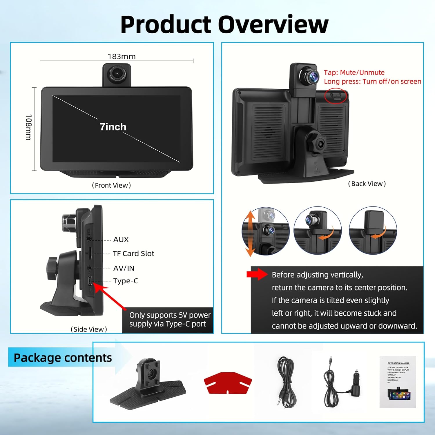 Front Camera Dashcam 1080P with Loop Recording: Equipped with a 1080P front camera, adjustable vertically or horizontally, to monitor road conditions or observe children in the back seat. Attention: This carplay car does not include TF card. You will need to purchase a microSD card separately for recording.
