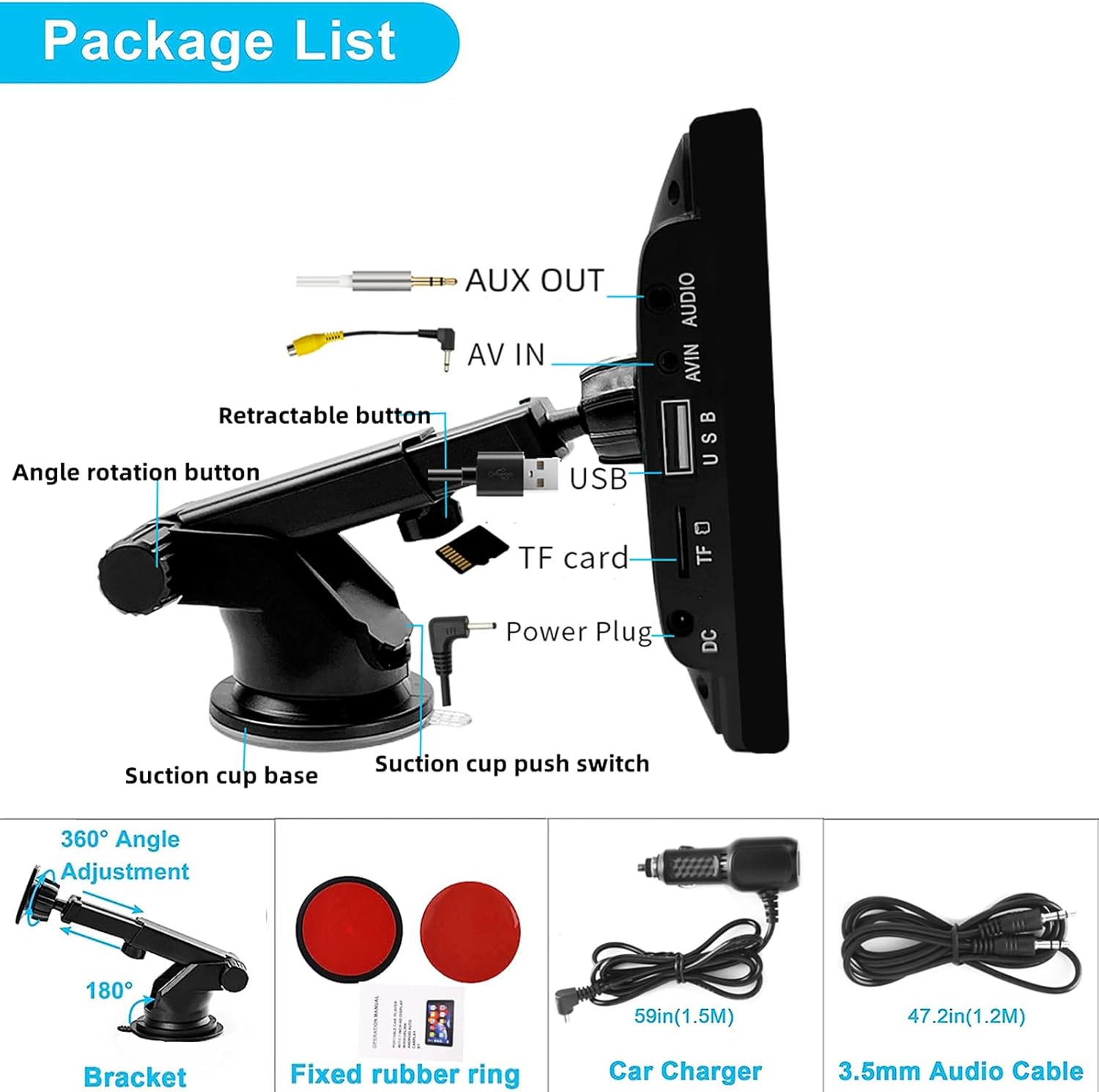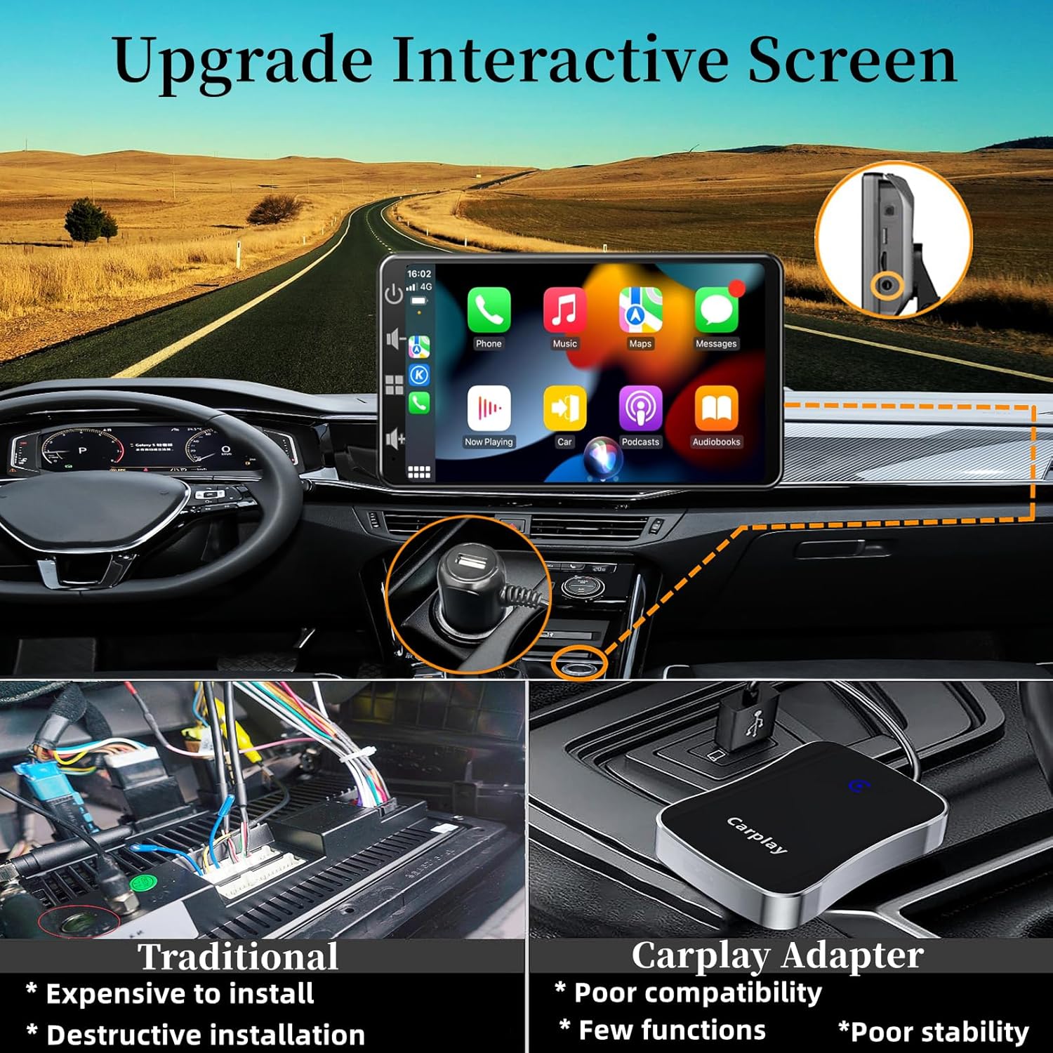 【Easy Installation & Fit for Various Cars】This car carplay screen comes with a self-adhesive bracket and a suction cup mounting base, allowing you to easily attach it to smooth surfaces such as dashboard or windshield. It is easy to install, just plug it in and go, the voltage of our dash mounted carplay is 12-30V, which can fit all different cars, such as RVs, pickups and pickups.