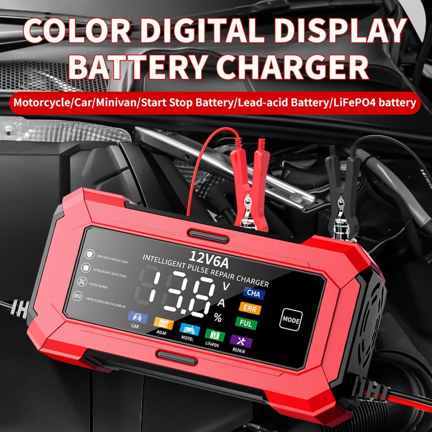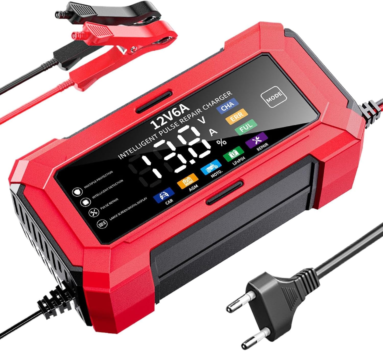 URAQT Cargador de Batería, Cargador de Batería de Moto 12V/6A, Inteligente con Función de Reparación Automática y Pantalla LCD Cargador de Batería de Coche para Coches, Motos, AGM, Gel, SLA