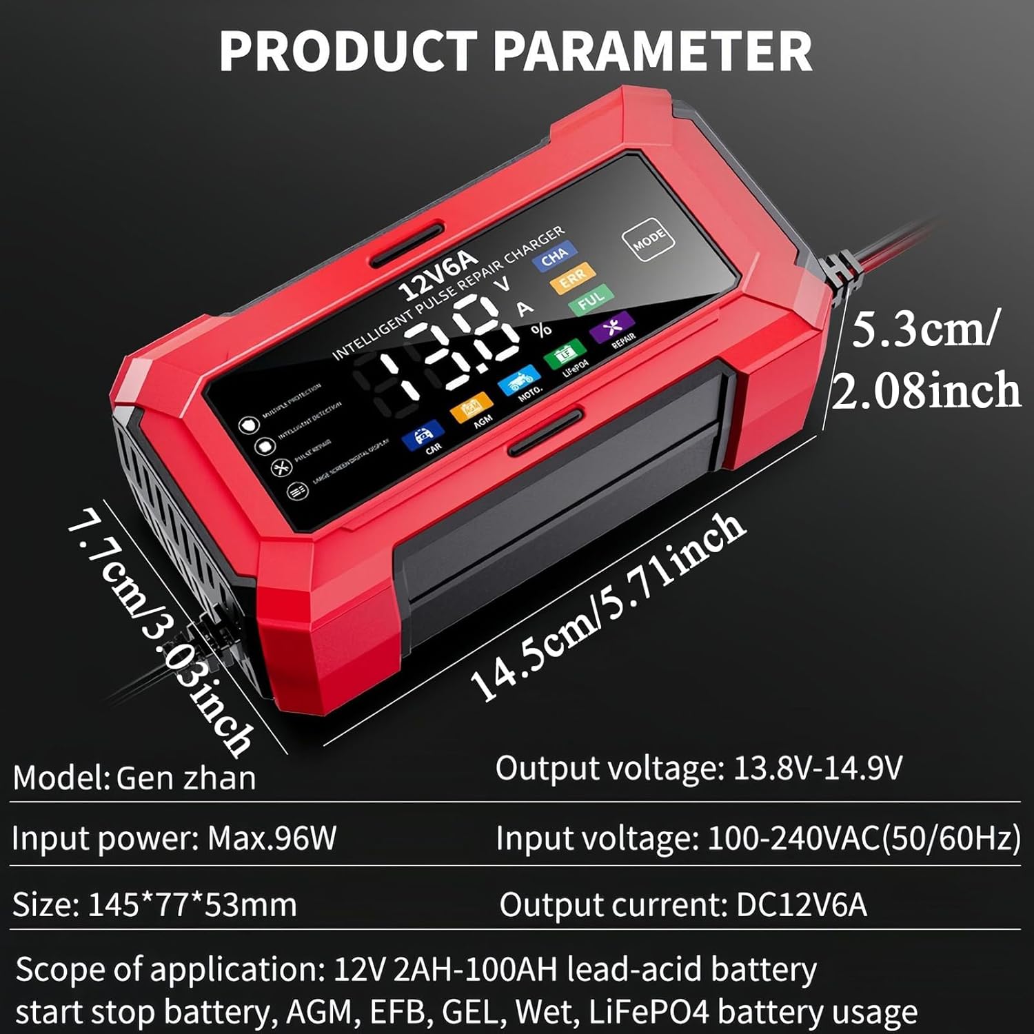 Portabilidad optimizada: Diseñado con configuración interna optimizada para máxima disipación de calor, garantiza confiabilidad en formato fácil de transportar que satisface las necesidades de carga de baterías de automóvil.