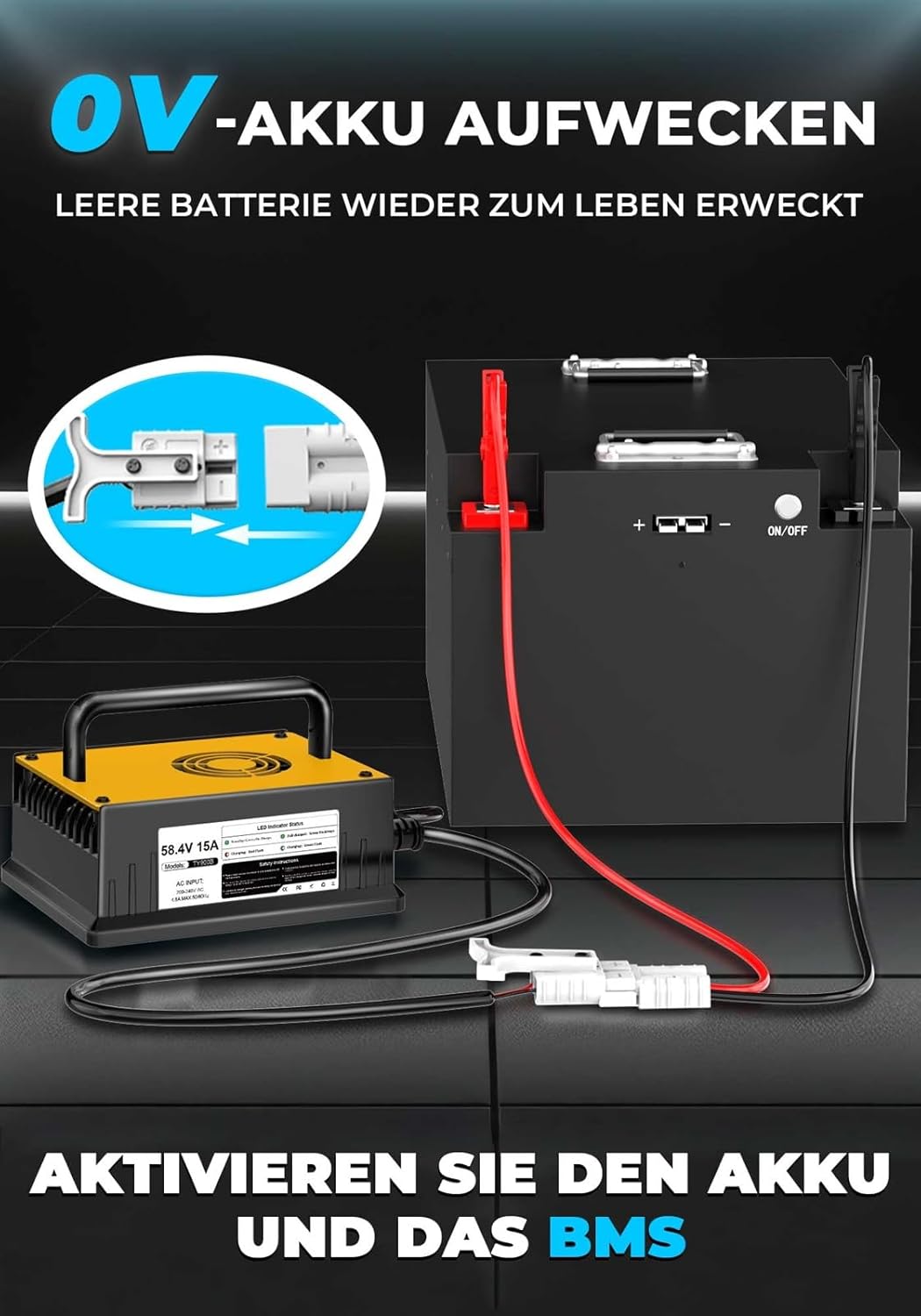 Modo de activación (despertar) cargando a “0V”: Restablece y repara la batería después de la protección de corte BMS (sistema de gestión de batería). Cuando olvide cargar la batería regularmente durante un período prolongado, nuestro cargador de 58,4 V 15 A puede activar sus baterías LiFePO4 de 48 V con bajo voltaje.