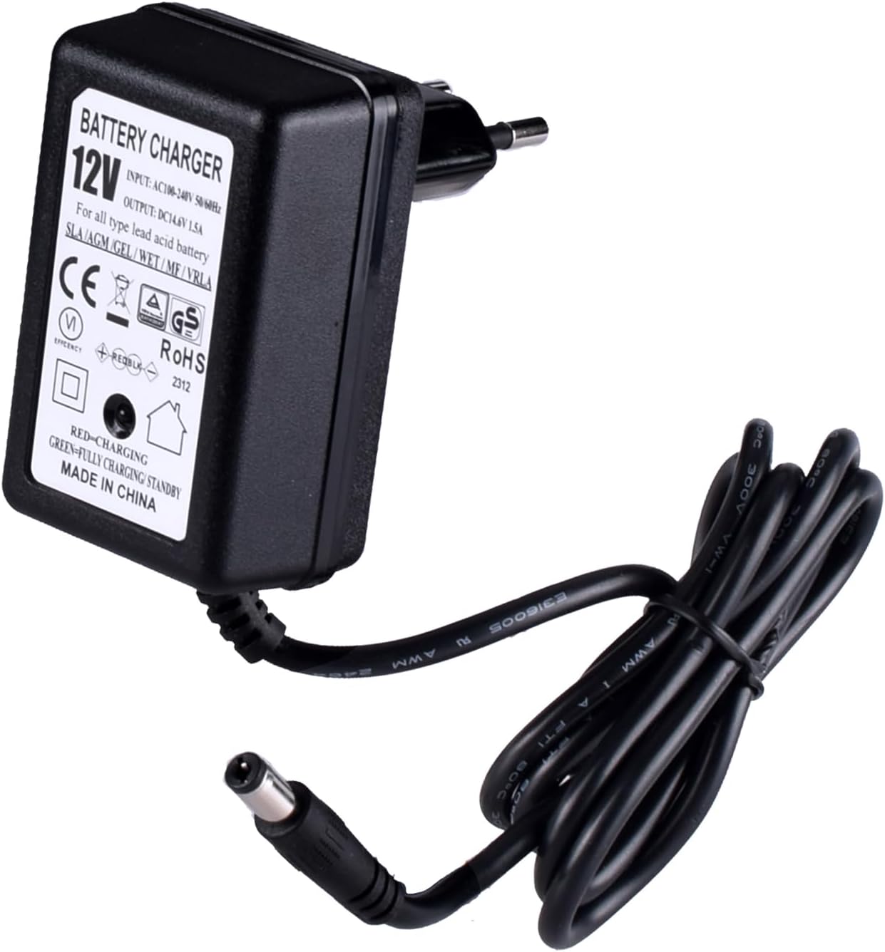 Cargador de Baterías Plomo 12V 1500mA Multiprotección con Circuito PFC, Apto para Vehículos Infantiles, Juguetes, Motos, Scooters, etc. con Salida DC55 x 21