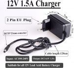 Detalles: Entrada: AC 100 V – 260 V, 50 / 60 Hz. Voltaje de salida: 12 V CC (8 V – 14,6 V). Corriente de salida: 1,5a ± 0,1a (disminuyendo con el proceso de carga). Longitud del cable eléctrico: 100 cm / 39,4 pulgadas