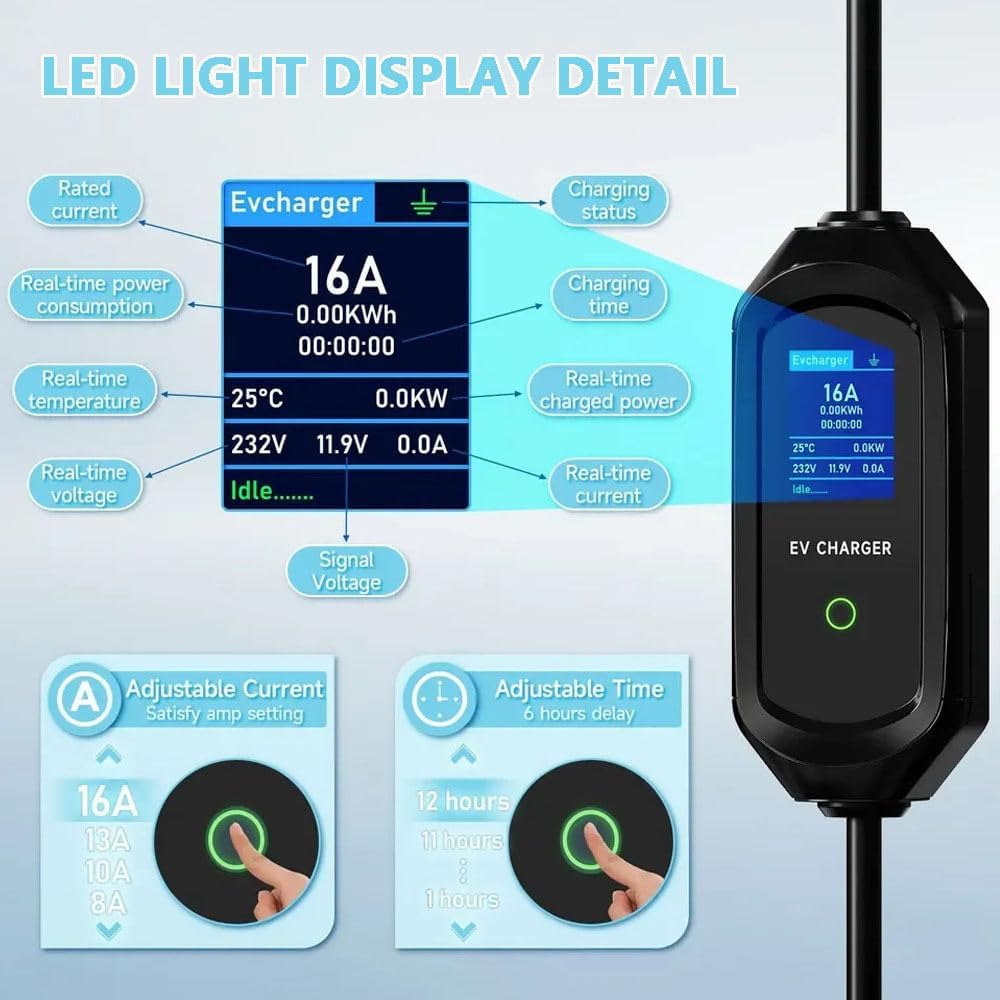 Cargador portátil para vehículos eléctricos 3.6KW 16A Cargador para vehículos eléctricos Estación de carga rápida Caja de pared para el hogar Pantalla digital Cable opcional 3.5/5M Plug and Play 5M