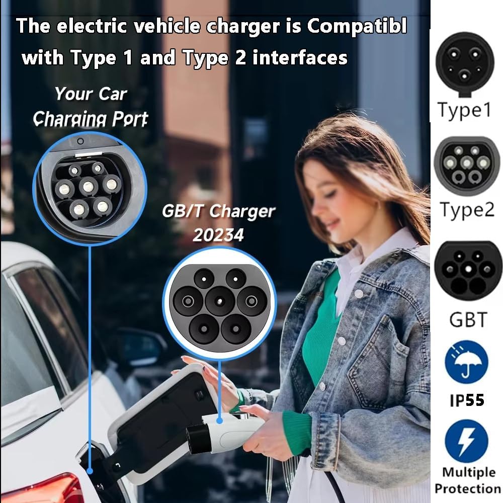 【Compatibilidad y comodidad】 El cargador para vehículos eléctricos es compatible con interfaces Tipo 1 (estándar EE). Uu.) y Tipo 2 (reglamento UE). Podrás comprobar la compatibilidad del cargador según tu modelo; Dispone de cables de extensión de 3,5/5 metros, que se adaptan a diversas situaciones, como garajes domésticos y campamentos.