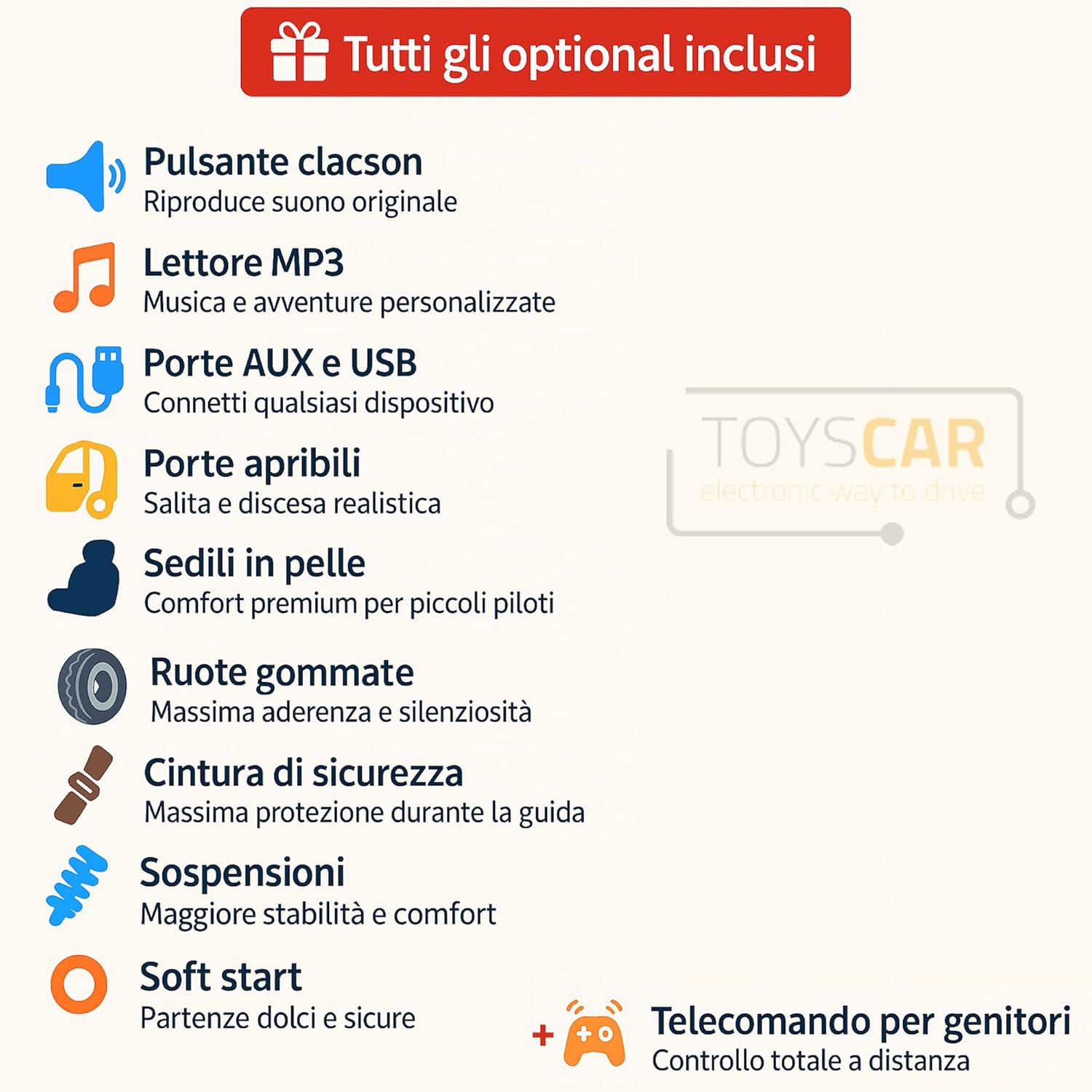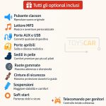 Verde y completo opcional: Alimentado por una batería recargable de 24 V, es ecológico y rico en opcionales: faros LED, reproductor de MP3 con puerto USB y AUX. Todo para hacer la conducción aún más realista y atractiva.