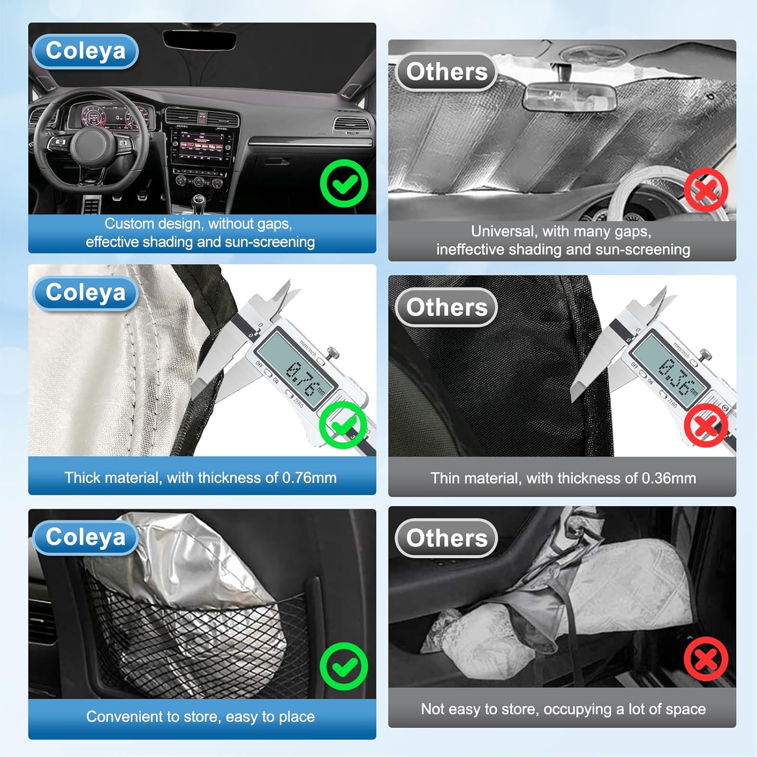 【Excelente material】El parasol Golf 7 tiene un diseño personalizado y se puede alinear con los bordes del parabrisas delantero en el interior del vehículo. Después de la instalación, se ajusta perfectamente al parabrisas, no presenta grietas y queda total y eficazmente protegido contra el sol. Nuestra funda para parabrisas tiene un grosor de 0,75 mm, es resistente a las arrugas, es más gruesa y duradera que la funda normal.