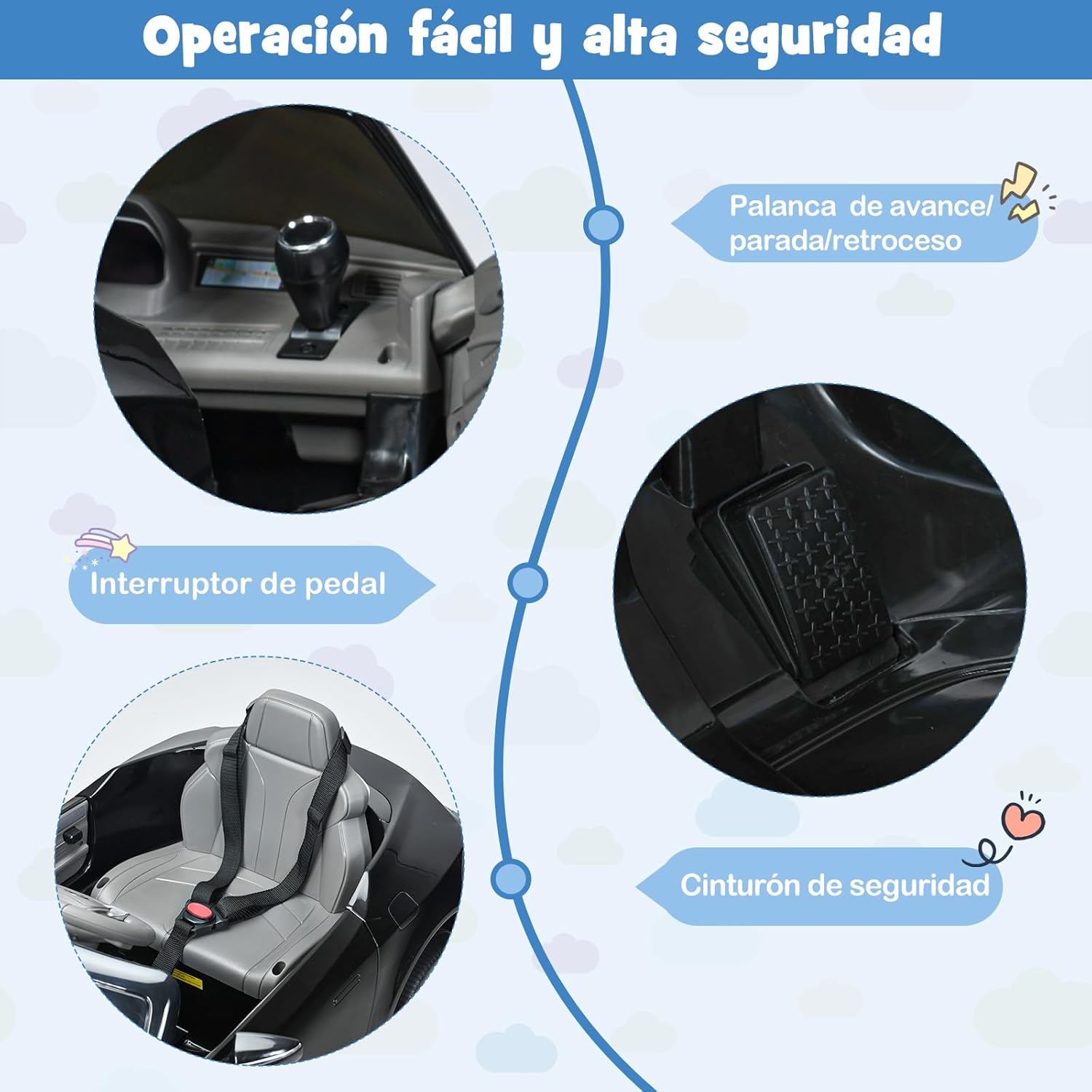 【Tecnología avanzada para una conducción más segura】 La tecnología avanzada de arranque lento está cuidadosamente diseñada para brindar una experiencia de conducción segura. Además, cuenta con una suspensión de resortes premium en las ruedas traseras, lo que contribuye significativamente a mejorar la estabilidad general del vehículo. Los cinturones de seguridad de 3 puntos aumentan la seguridad en la conducción.