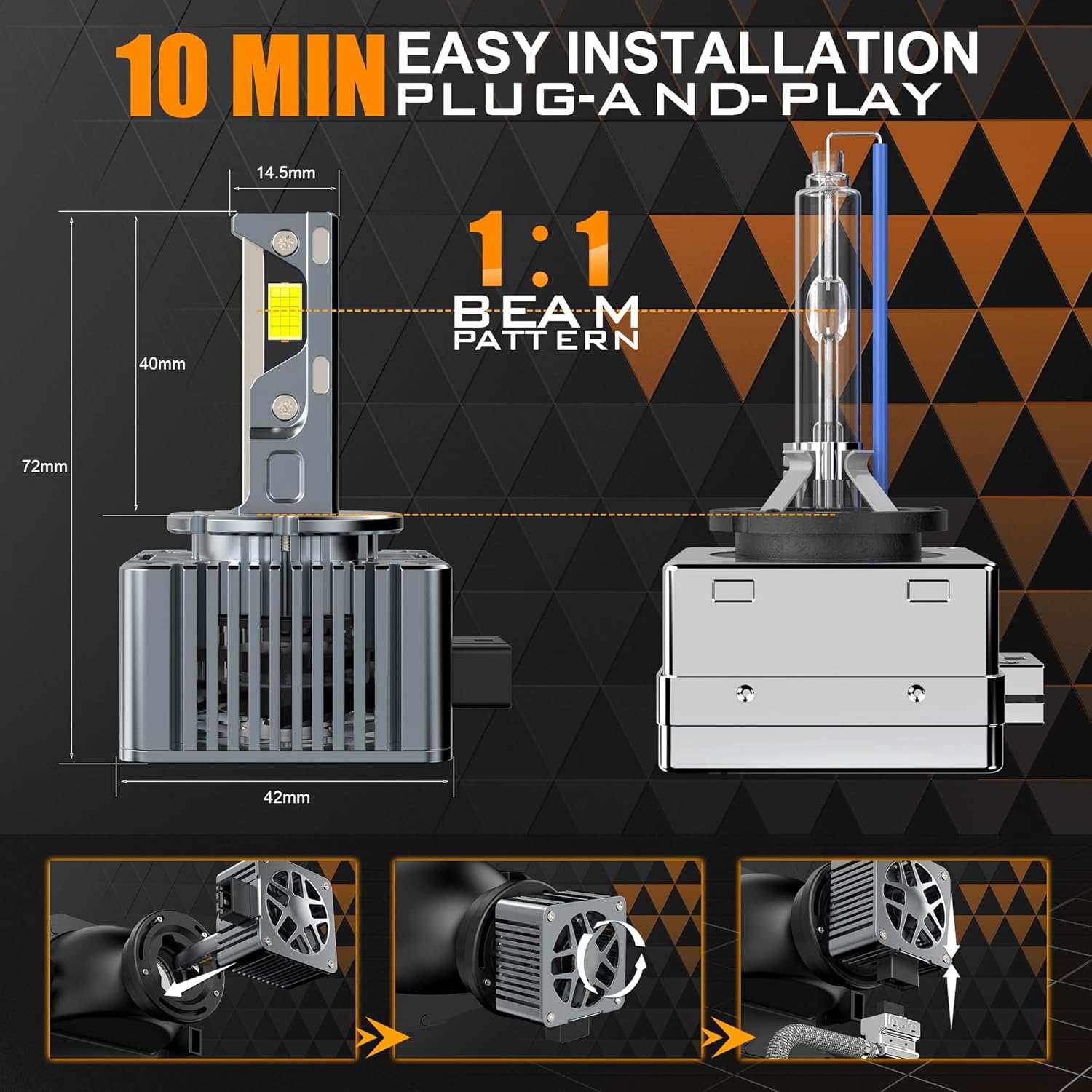 【Super Efficient Thermal Cooling System】The D1S LED bulb body is made of aviation aluminum for heat dissipation with powerful cooling fan. Efficient cooling system for better heat dissipation and longer service life. Easy plug and play installation to directly replace the original halogen bulb of the same model.