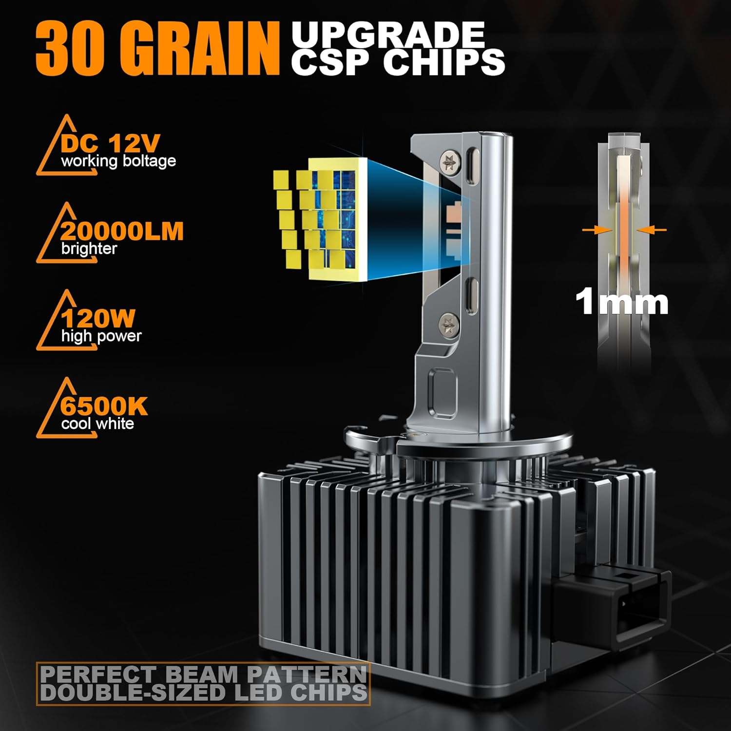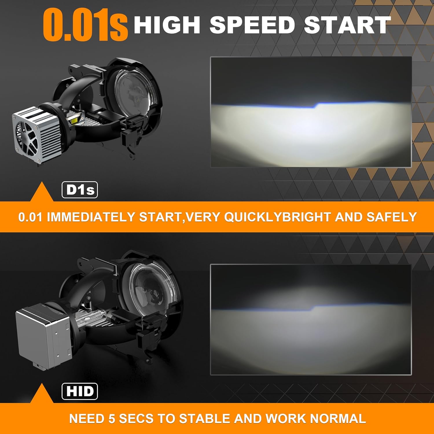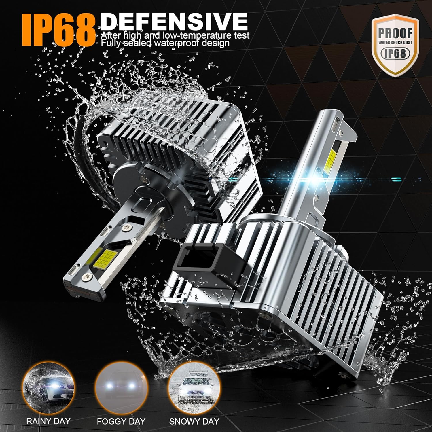 360 degree light increases visibility and durability: focused light beam, no dark spots and no blinding oncoming drivers. Perfect light beam, 360 degree illumination for optimal visibility. Long-lasting D1S LED bulb, over 50,000 hours, and a 18,000 RPM silent cooling fan with a lifespan of 50,000 hours. IP68 waterproof rating prevents water, snow, moisture and dust from entering.