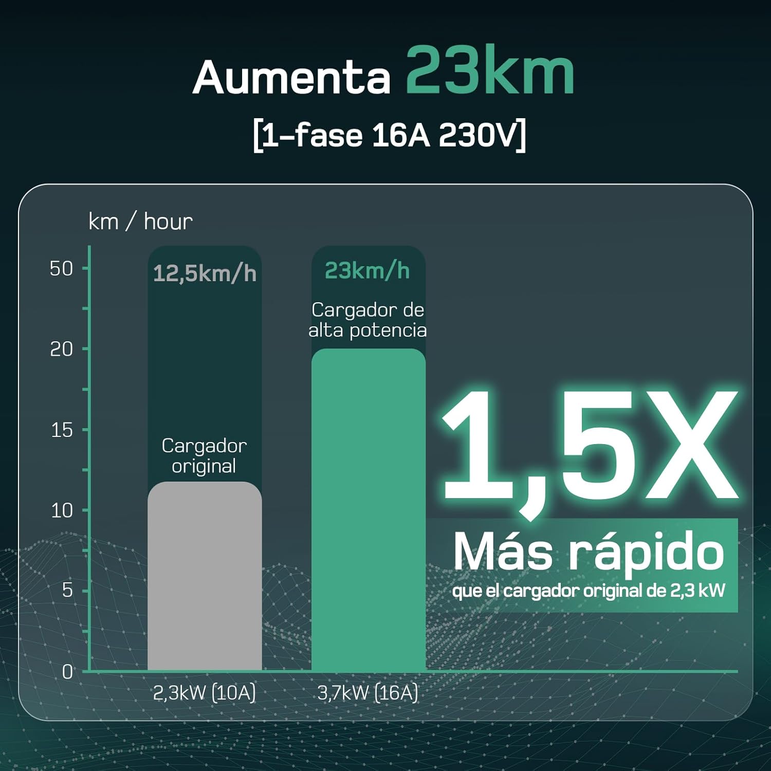 Cargue más rápido, salga antes El cargador de automóvil eléctrico es 1,5 veces más rápido que el cargador original, lo que reduce el tiempo de carga a solo 3 a 5 horas. Con un enchufe Schuko de 16A, ajustable entre 6A/8A/10A/13A/16A, ofrece la flexibilidad para satisfacer sus necesidades.