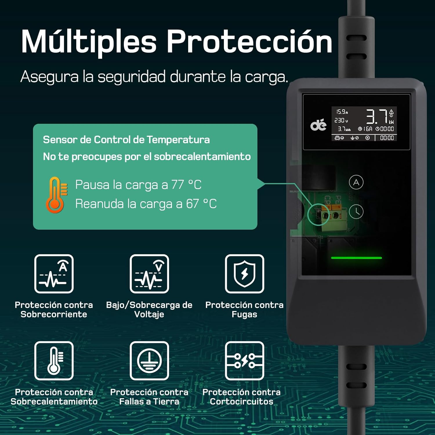 Duradero y confiable: fabricado con material TPU duradero, el cargador EV “dé” está equipado con una gama completa de protecciones de seguridad, que incluyen protección contra sobrecorriente, bajo/sobrevoltaje, fugas, sobrecalentamiento, conexión a tierra y protección contra cortocircuitos, lo que garantiza una alta confiabilidad. El cargador también está certificado según las normas CE, TUV e IEC. Experimente una conectividad fluida, una durabilidad excepcional y tranquilidad con el cargador para vehículos eléctricos “dé”.