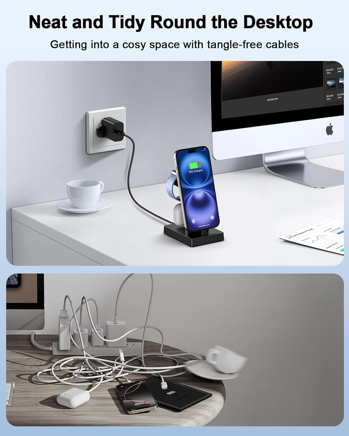 Estación de carga 3 en 1: el soporte de carga ADADPU puede cargar iPhone, auriculares y iWatch al mismo tiempo. El diseño integrado de la estación de carga ahorra espacio, sin necesidad de ajustar la posición durante la carga. Exquisita artesanía con funcionamiento minimalista, organiza eficazmente los cables de escritorio, solución de carga ideal para el hogar y la oficina.