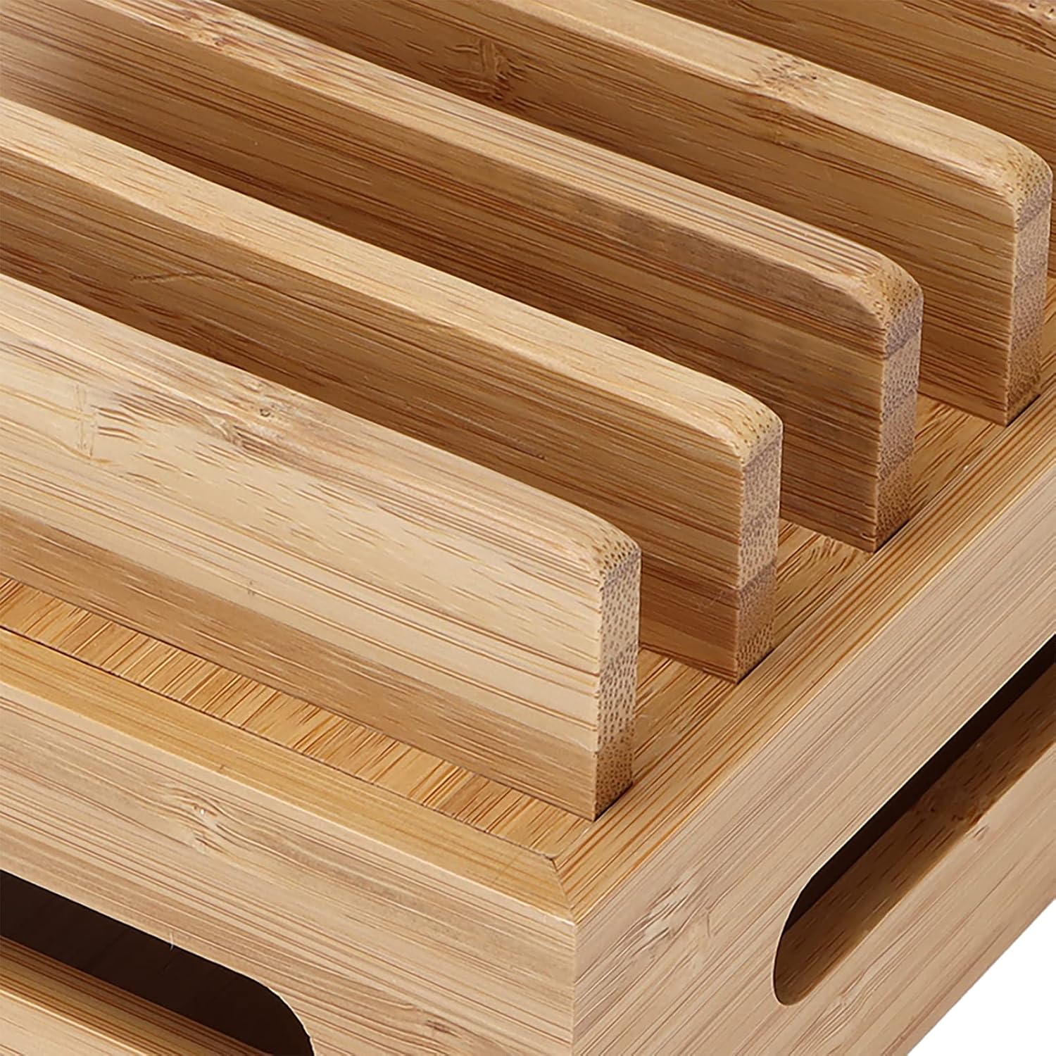 DISEÑO COMPACTO Y ELEGANTE: el organizador del teléfono presenta un acabado de madera que combina perfectamente con cualquier decoración. El diseño de su estación de acoplamiento de escritorio incluye ranuras de soporte de almacenamiento para guardar teléfonos y tabletas de forma segura, manteniendo su espacio de trabajo ordenado y funcional.