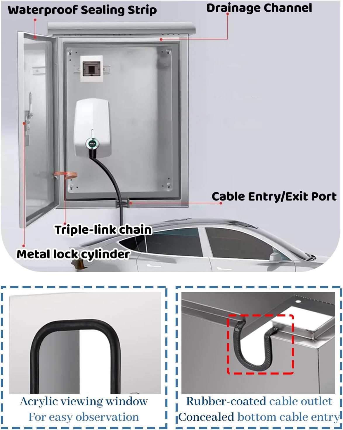 Estaciones de carga para coches eléctricos Caja de carga para vehículos eléctricos de acero inoxidable con ventana de visualización, funda protectora impermeable para cables (30 x 40 x 20 cm/11,8 x 15,7 x 7,8 pulgadas)
