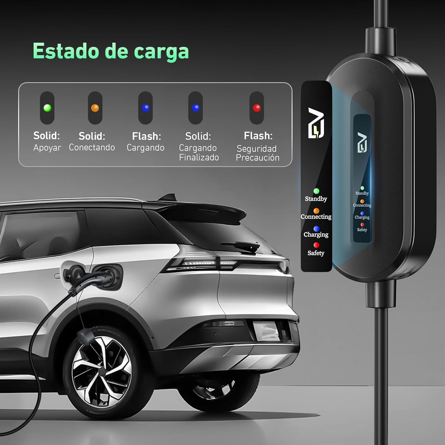 【INDICADOR LED】 Un indicador LED inteligente muestra el estado de carga en tiempo real. Cuando el cargador Tipo 2 está conectado a la fuente de alimentación, el LED verde permanece encendido. Cuando se conecta al vehículo eléctrico, el LED amarillo permanece encendido. Durante la carga, el LED azul parpadea. Cuando el LED azul permanece encendido, la batería está completamente cargada. Una luz roja parpadeante indica un error.