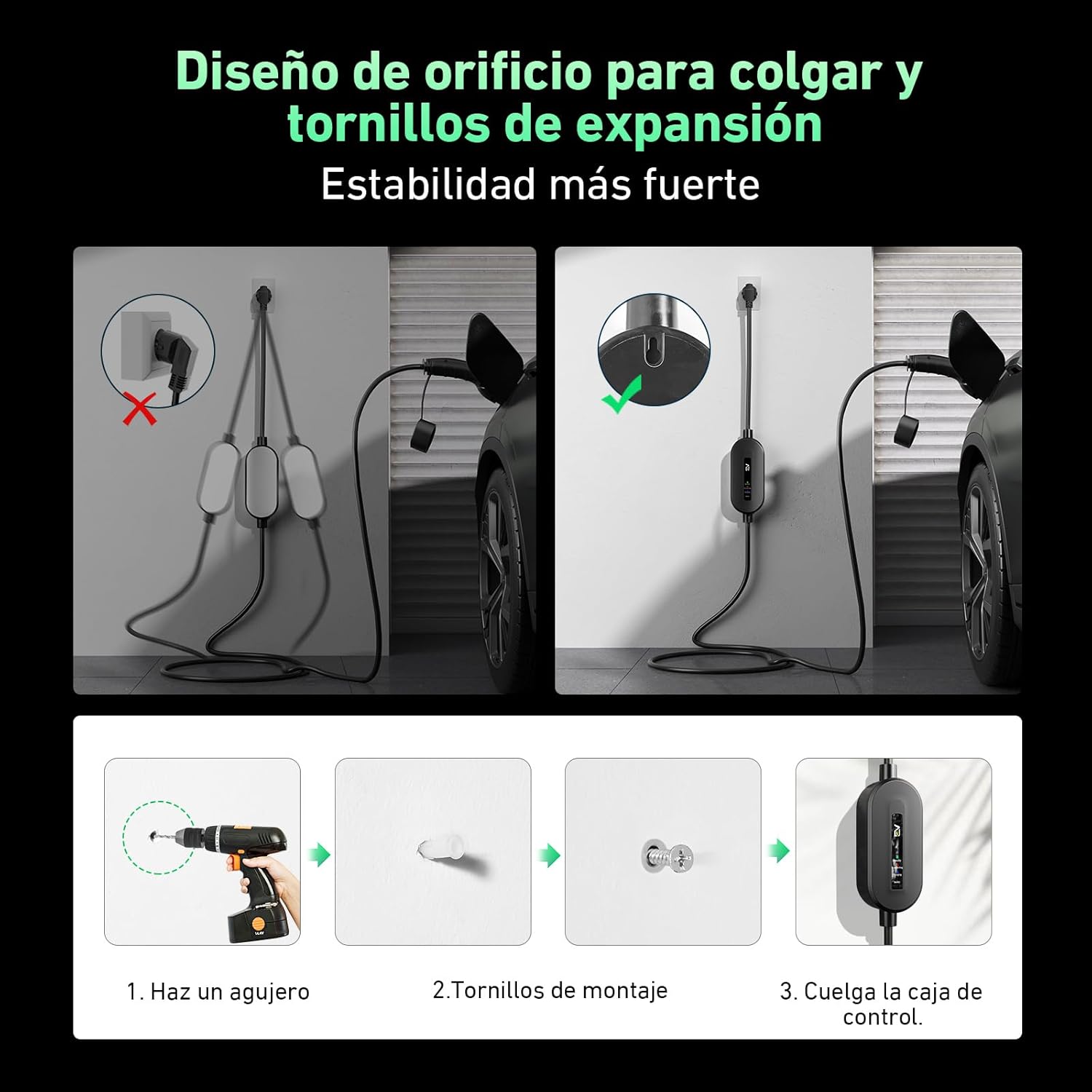【PORTÁTIL】 La caja de papel portátil negra es portátil y elegante. Los tornillos de expansión se utilizan para colgar el cargador del coche eléctrico en la pared como un pequeño cargador de móvil. La bolsa y el velcro sirven para guardarlo, y puedes mantener el maletero limpio y organizado después de usar el cargador del coche en tiempo lluvioso y polvoriento. Puedes llevarlo en tu coche cuando visites a familiares y amigos.