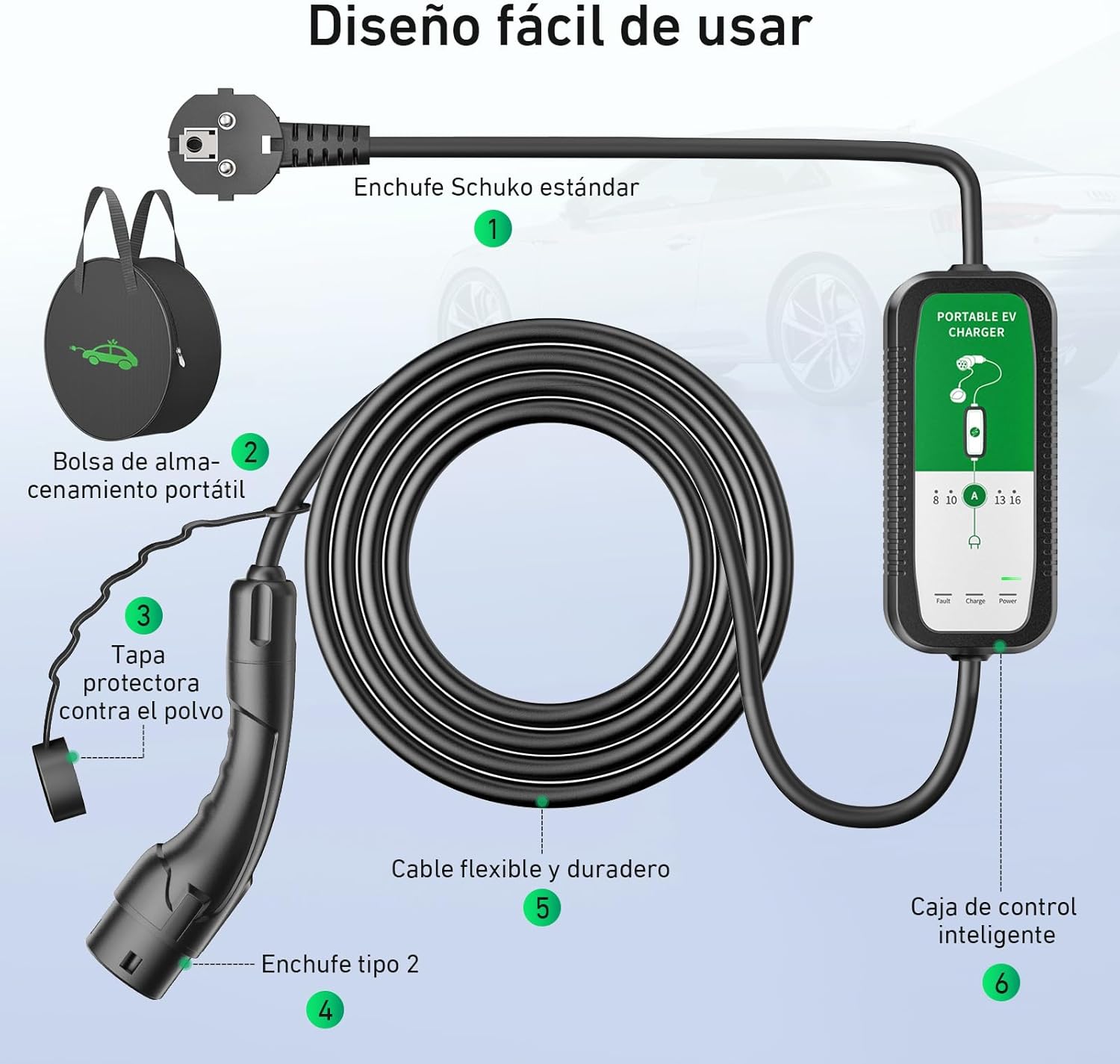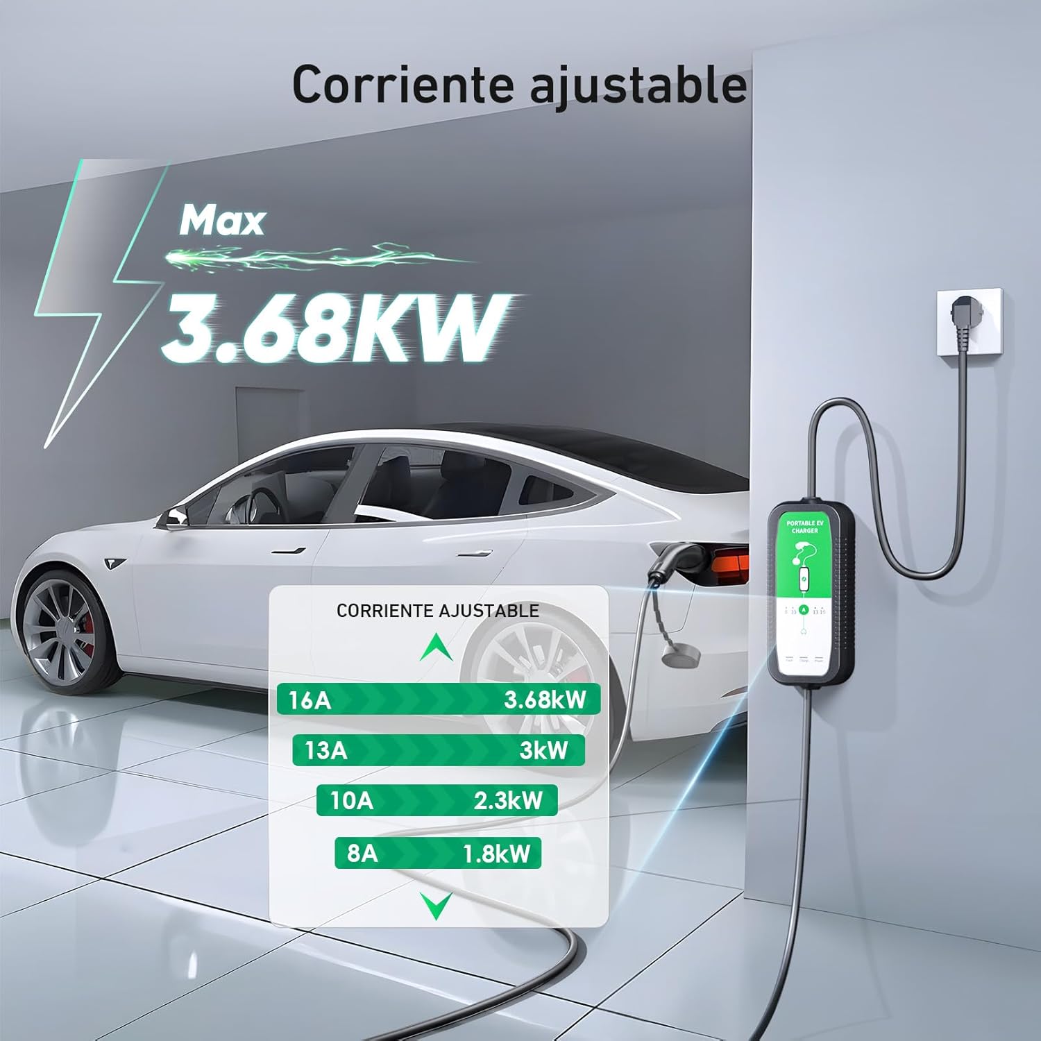 【Carga Rápida 3,68 kW】 Este cargador para coche eléctrico tipo 2 ofrece una corriente máxima de 16A, lo que permite cargar 1,6 veces más rápido que los cargadores tradicionales (10A). Con una potencia de carga de hasta 3,68 kW (230 V x 16 A), satisface tus necesidades de carga rápida.