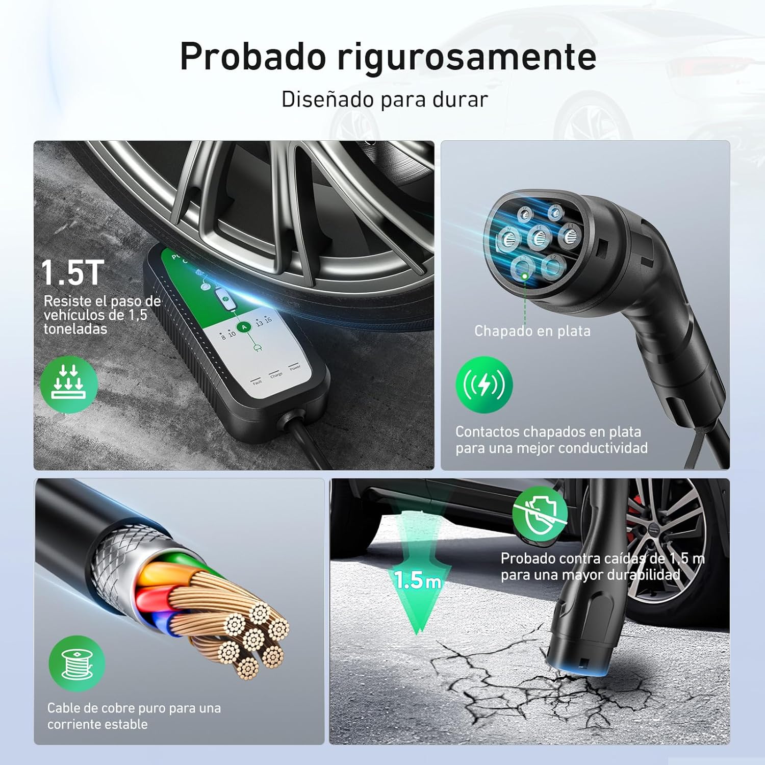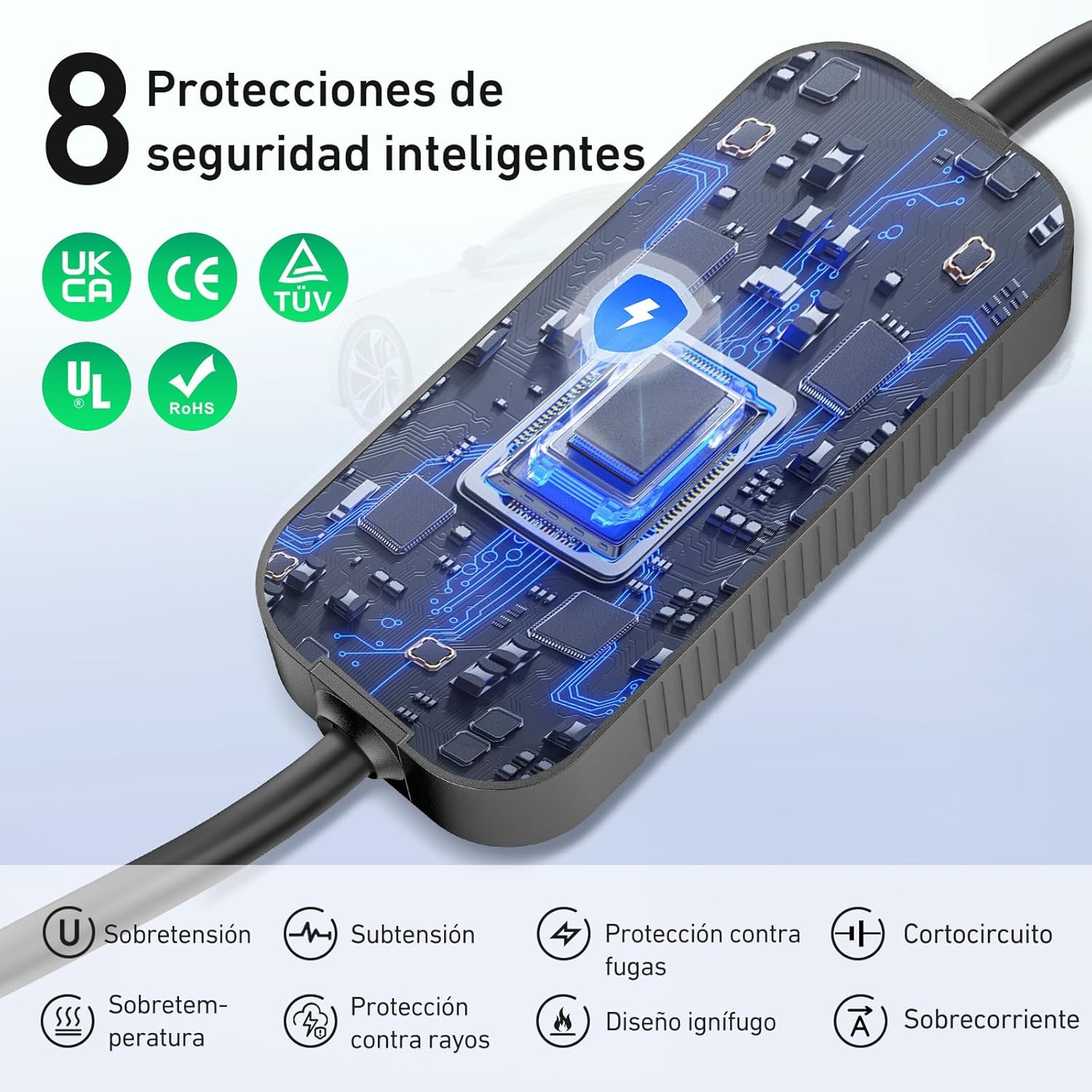 【Múltiples protecciones de seguridad】Cargador tipo 2 certificado CE/UKCA/RoHS/TÜV/UL. Equipado con un chip inteligente que ofrece múltiples protecciones (sobrecorriente, sobretensión, sobrecalentamiento, cortocircuito, etc.). Cuando finaliza la carga, se detiene automáticamente para evitar la sobrecarga. El enchufe (Tipo 2) tiene protección contra el agua IP67; Unidad de control resistente al polvo y salpicaduras (IP54). Evite sumergir la unidad o exponerla durante mucho tiempo a lluvias intensas.