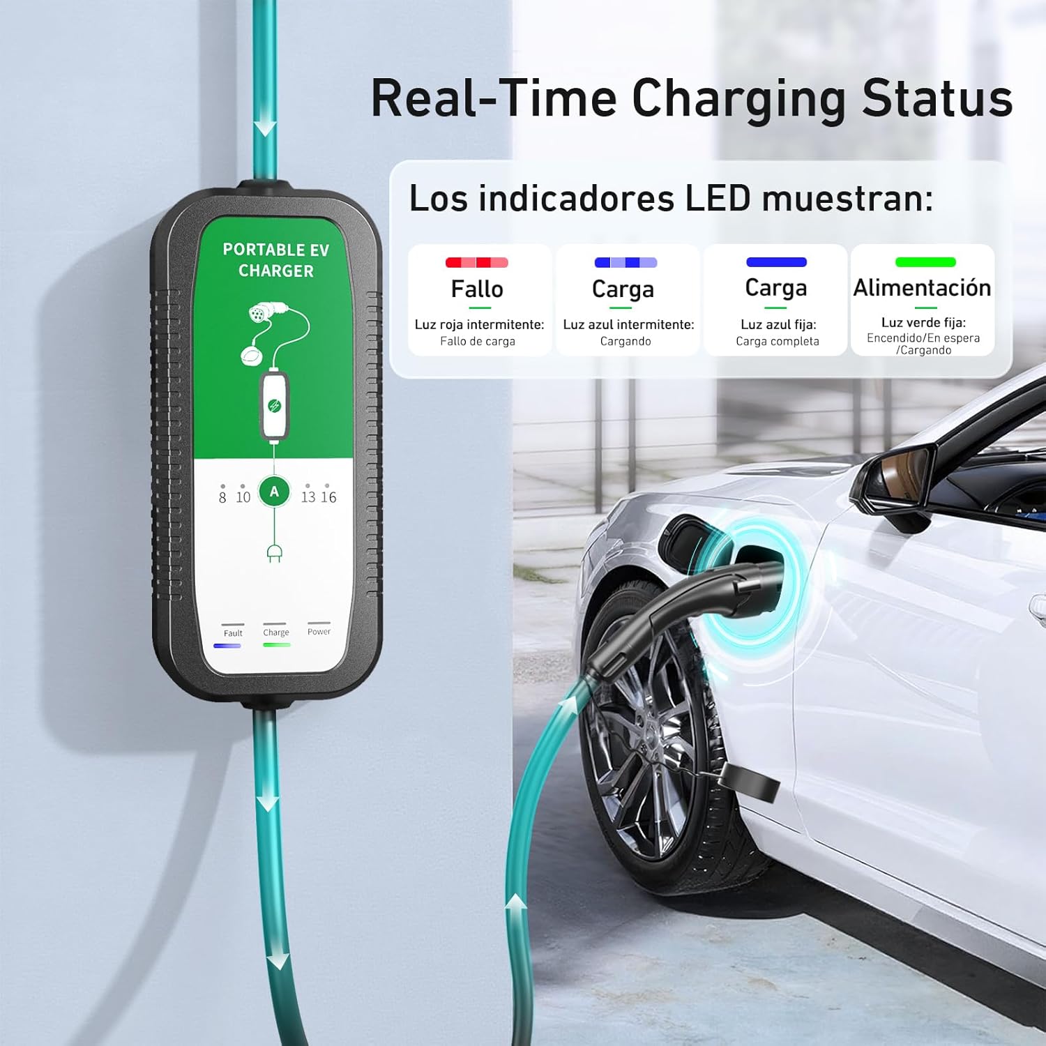 【Indicador de carga inteligente】Este cargador de coche eléctrico incluye 3 indicadores LED para controlar fácilmente el estado de la carga. La luz de encendido es verde en modo de espera; La luz de carga parpadea en azul durante la carga. Una vez completado, la luz “Carga” permanece fija en azul. Un rojo intermitente indica un mal funcionamiento.