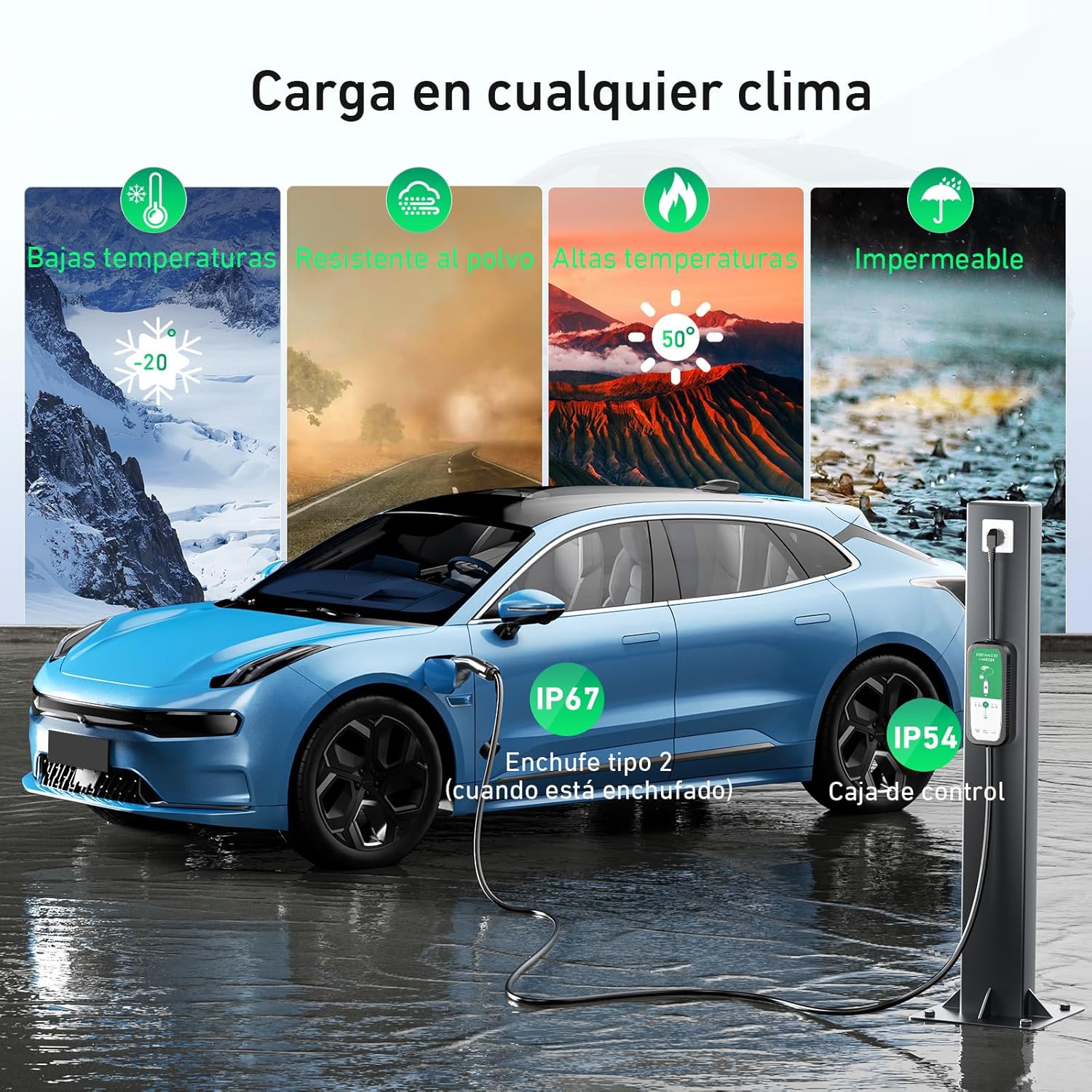 【Múltiples protecciones de seguridad】Cargador tipo 2 certificado CE/UKCA/RoHS/TÜV/UL. Equipado con un chip inteligente que ofrece múltiples protecciones (sobrecorriente, sobretensión, sobrecalentamiento, cortocircuito, etc.). Cuando finaliza la carga, se detiene automáticamente para evitar la sobrecarga. El enchufe (Tipo 2) tiene protección contra el agua IP67; Unidad de control resistente al polvo y salpicaduras (IP54). Evite sumergir la unidad o exponerla durante mucho tiempo a lluvias intensas.