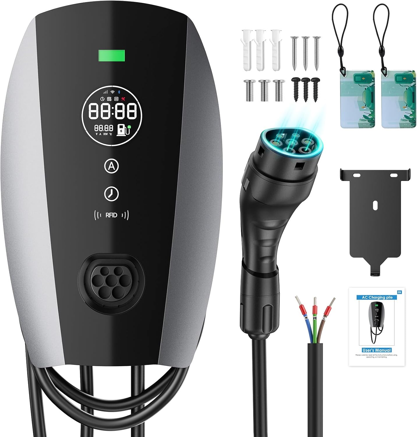 【ESTACIÓN DE CARGA PÚBLICA O DOMÉSTICA】 La caja de pared utiliza botones físicos y una pantalla LED para una interacción intuitiva. Carga inmediata tras pasar la tarjeta RFID, eliminando las complicaciones de la aplicación y facilitando su uso incluso en presencia de personas mayores. (Si pierde su tarjeta RFID, póngase en contacto con nuestro servicio postventa).
