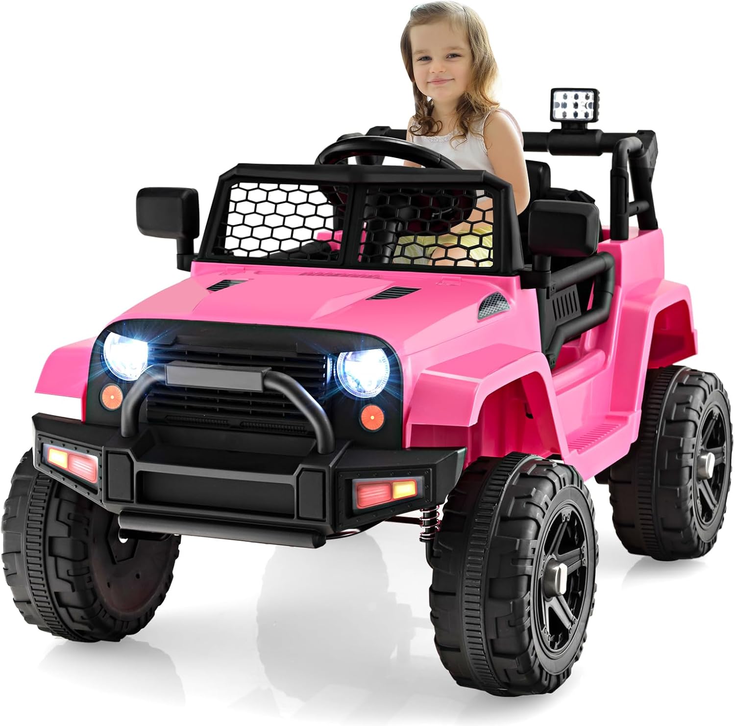 GOPLUS Coche eléctrico para niños de 12 V con mando a distancia de 2,4 G, vehículo para niños con USB, música y MP3, Jeep Auto con faros LED y bocina, 2,5-4,5 km/h, para niños a partir de 3 años (rosa)