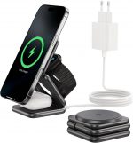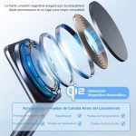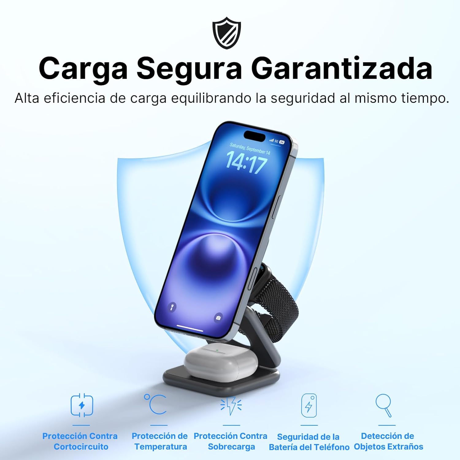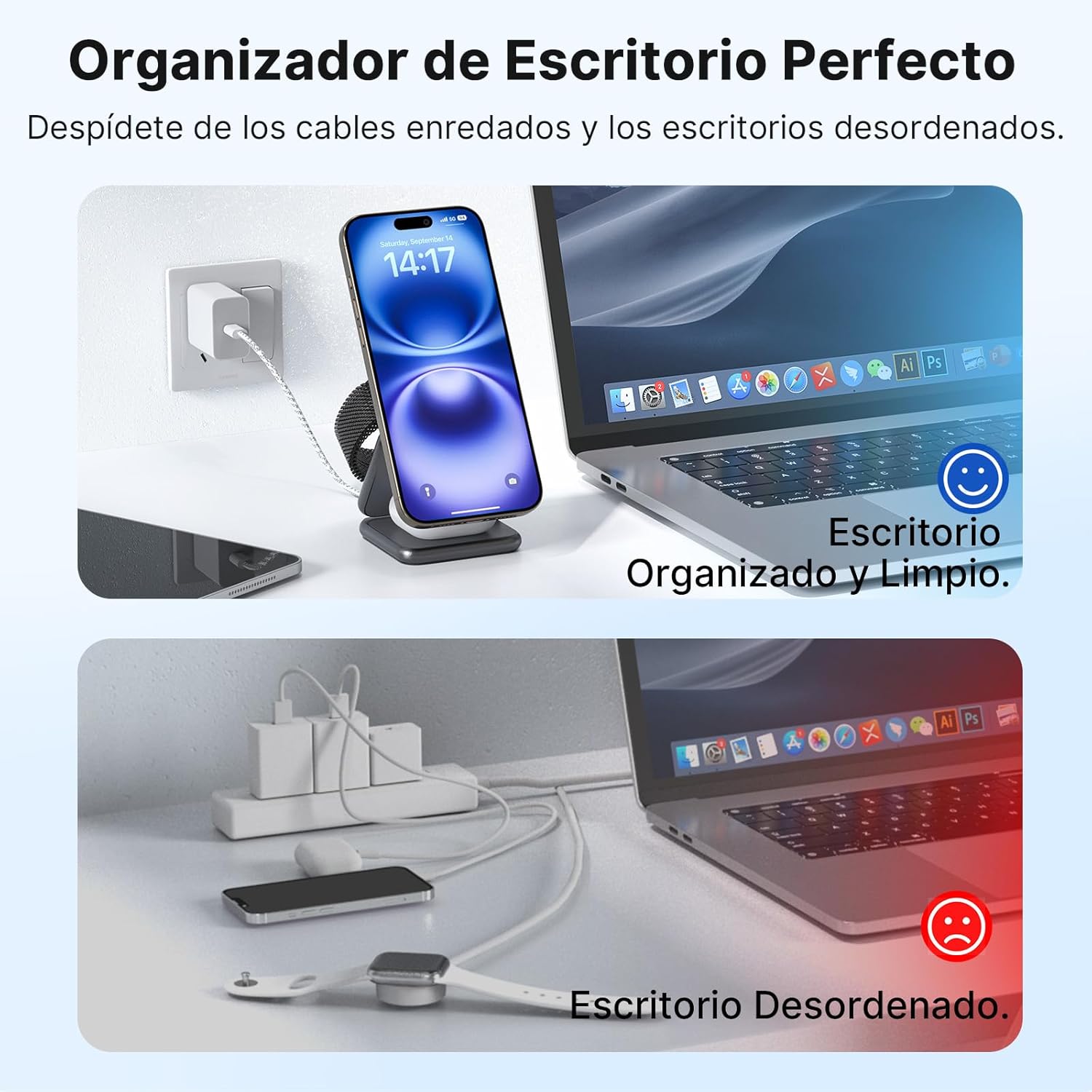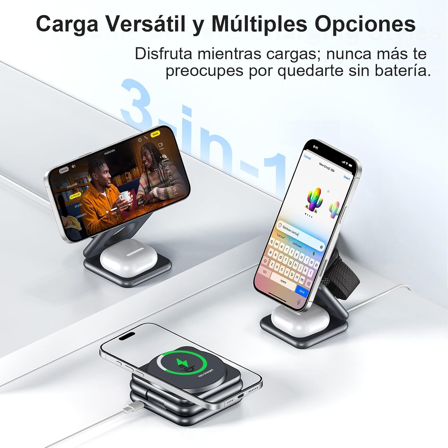 Ángulos de visión ajustables: disfrute de modos flexibles en formato horizontal o vertical con potentes imanes y tres bobinas de carga anchas. El diseño estable mantiene su iPhone firmemente en su lugar, asegurando una carga ininterrumpida con fundas MagSafe.