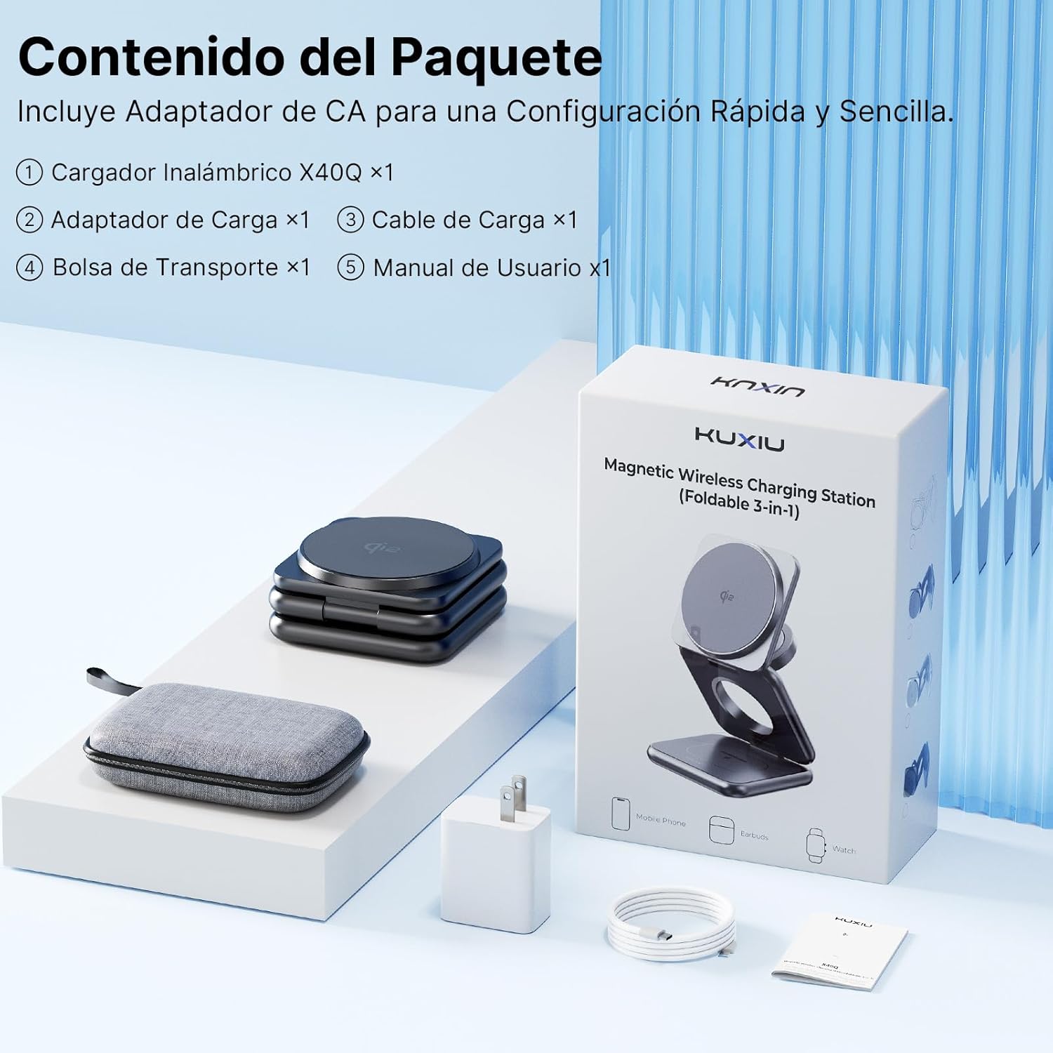 KU XIU X40Q Cargador Inalámbrico Magnético Plegable 3 en 1 con QI2 15W, Carga Rápida para iPhone 16/15/14/13/12, 5W para Apple Watch Series 9/8/7/Ultra/Ultra 2 y 5W para AirPods 4/3/2/Pro – Gris