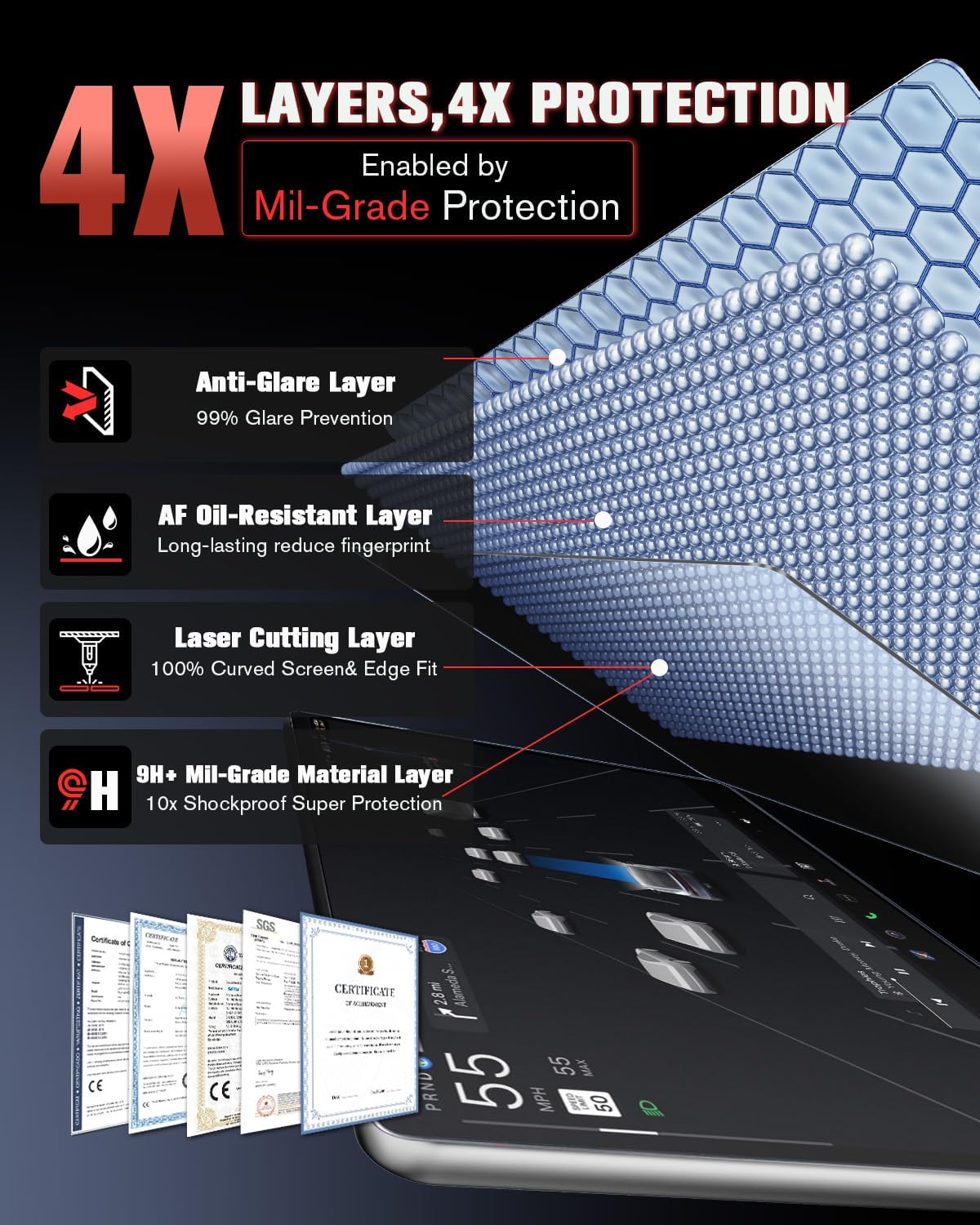 Are you tired of sunlight or facial reflections reflecting off your car’s central control screen while driving? AG’s matte screen protector uses diffuse optics technology to effectively reduce 80% of glare without compromising screen clarity. Whether day or night, your screen stays clear and bright, enhancing your visual experience while driving.