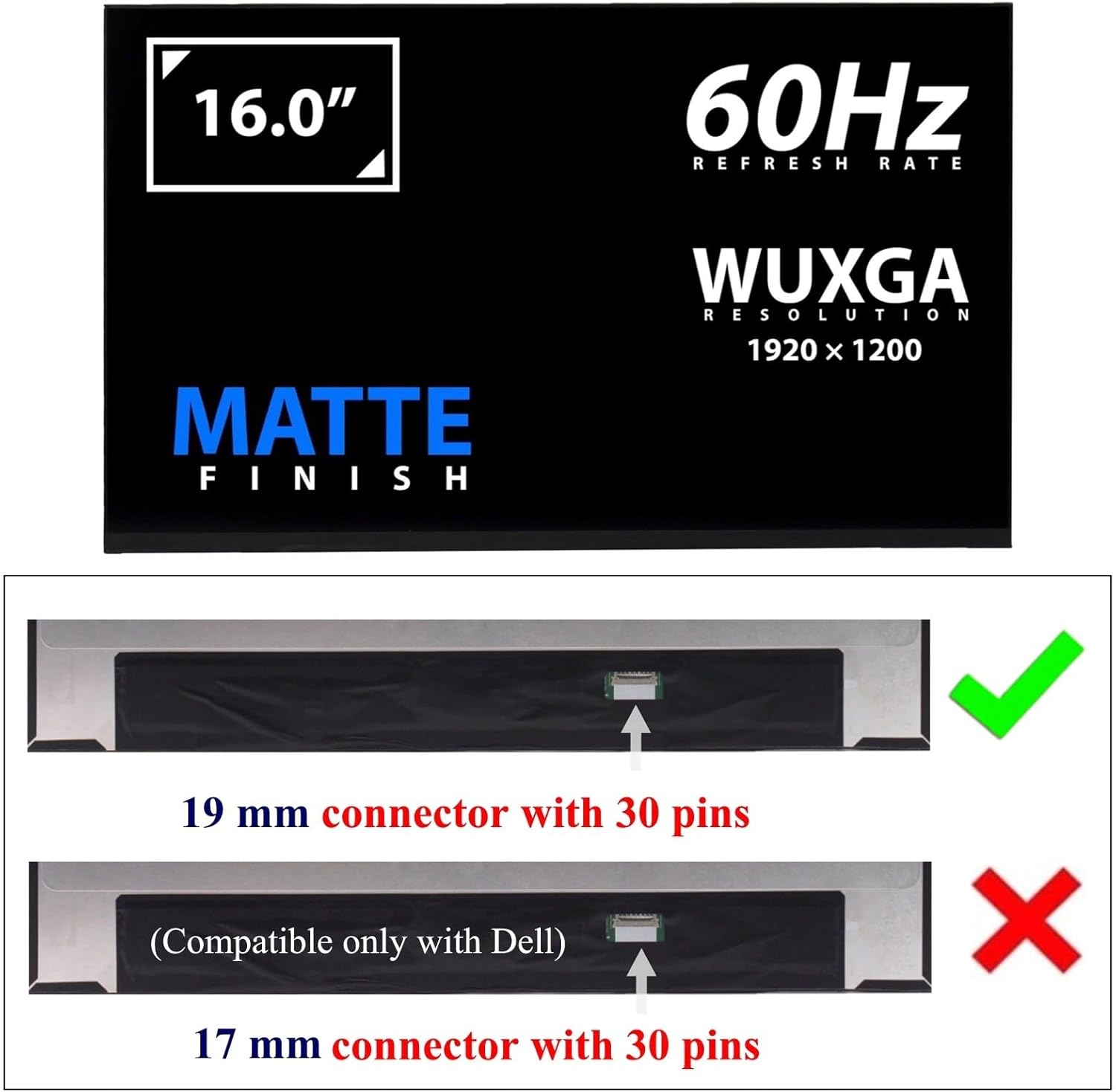 Tamaño de la pantalla: 16,0 pulgadas; Tipo de pantalla: pantalla IPS; Resolución de pantalla: 1920 x 1200 (FHD+); Velocidad de actualización – 60 Hz; Acabado de la pantalla: Mate; Conector de pantalla: 40 pines (Ubicado en la parte inferior derecha cuando se mira en la parte posterior de la pantalla). Panel táctil: toque en la celda; tenga en cuenta que esta pantalla no tiene soportes de tornillo (como se muestra en la imagen). POR FAVOR NOTE ESTE ES UN IPS Y UN CONECTOR DE 19 MM CON ESCENA DE 30 PINES.