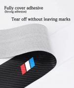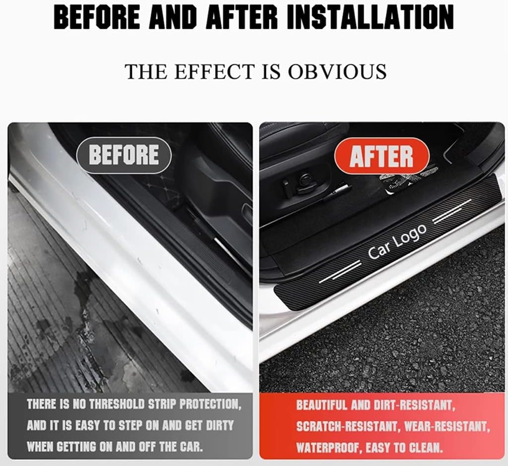 【Material y artesanía】Hecho de cuero de fibra de carbono para exterior, la pegatina en la parte posterior del umbral de la puerta está hecha de adhesivo 3M de alto rendimiento. Se adapta perfectamente al radian de los escalones y se dobla libremente. El logo está estampado en el molde. Se conserva permanentemente y el logo grabado con pan de oro tiene muy buen brillo.