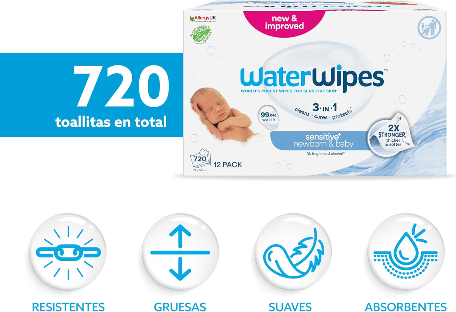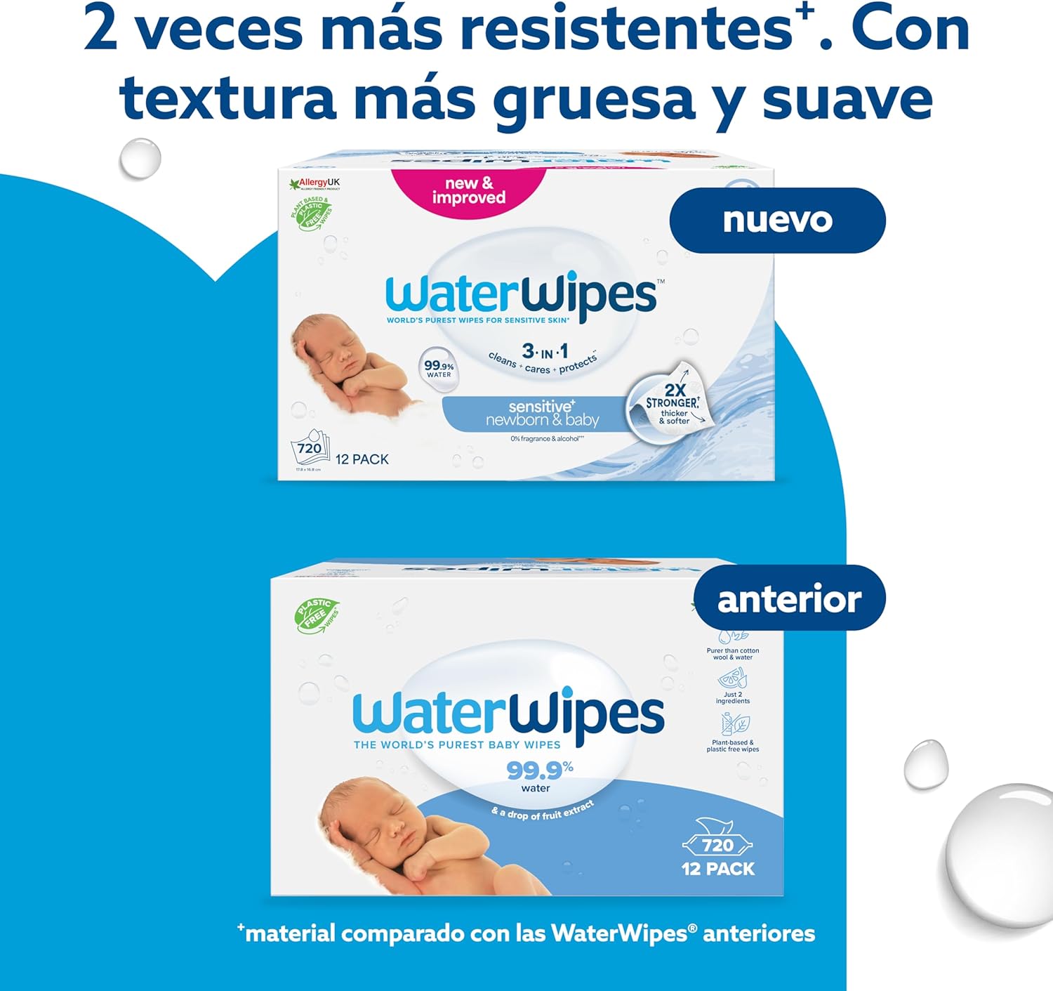 WaterWipes Sensitive+ Newborn & Baby Wipes, 720 Count (Pack of 12), 3-in-1 Cleans, Cares, Protects, 99.9% Water, Unscented