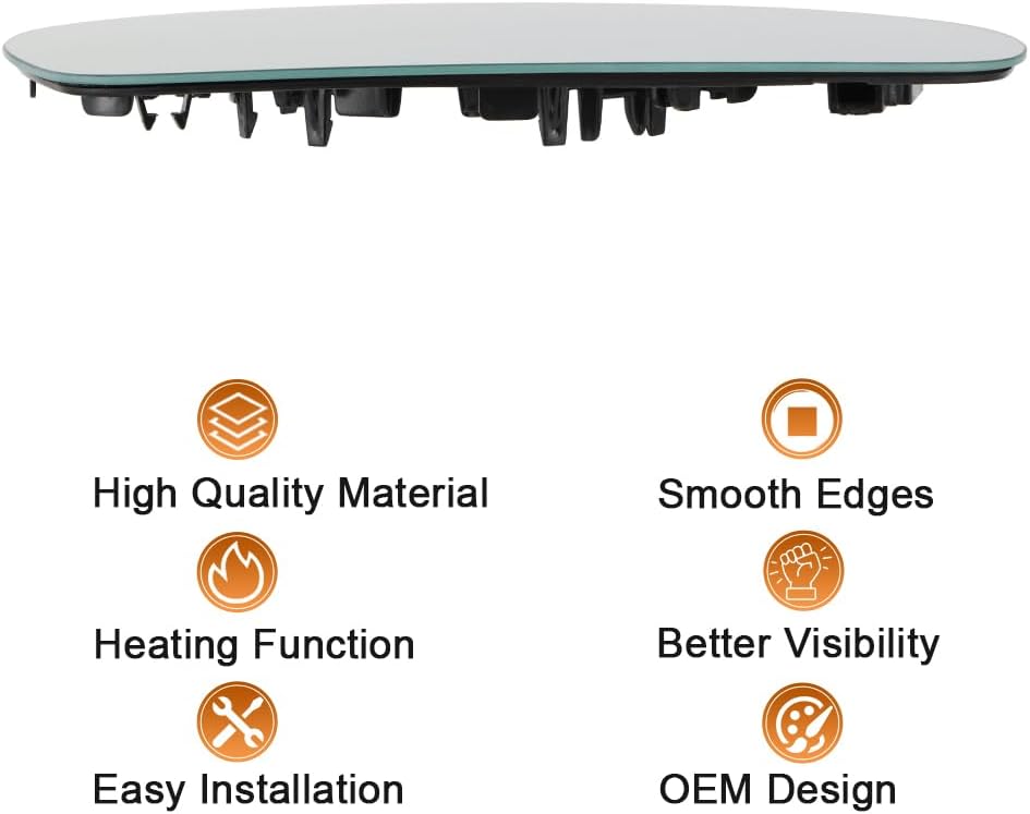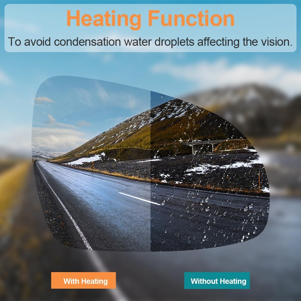 HEATING FUNCTION:This mirror glass is designed with heating function, to eliminate fog and melt snow or ice by heating from the inside out, improving driving safety in rain or fog.
