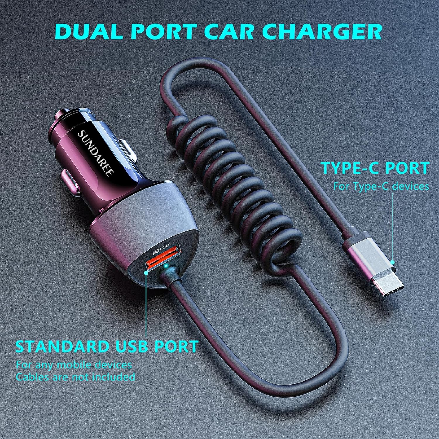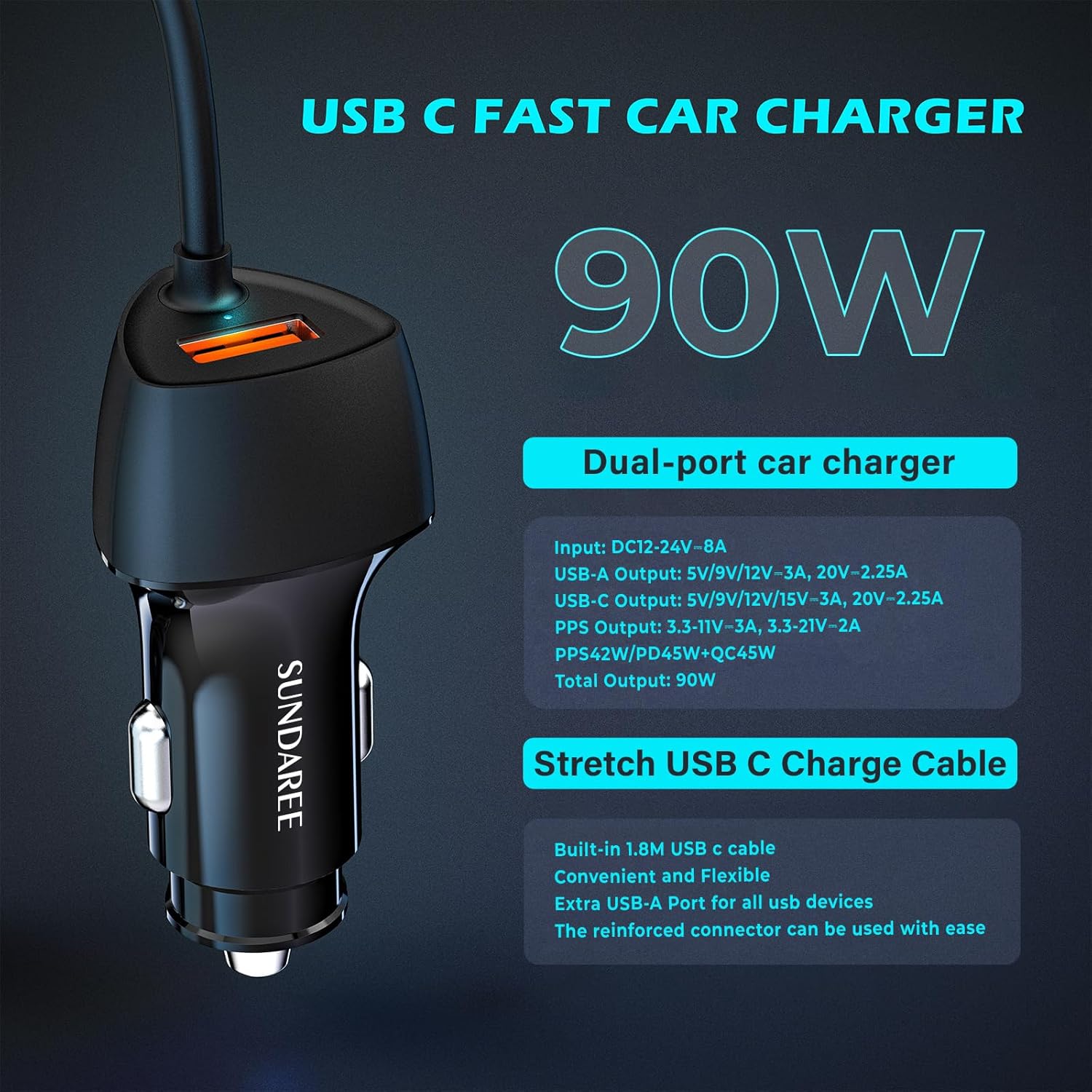 【Fast Charging & High Efficiency】The total output of dual USB car charger 90W, voltage 12V-24V, supports USB-A 45W Quick Charge 3.0 fast charging and USB-C 45W PD(42W PPS)USB C cable, can be quickly charged for 2 smartphones simultaneously, suitable for Android and iOS smartphones, 6 times faster than standard chargers.
