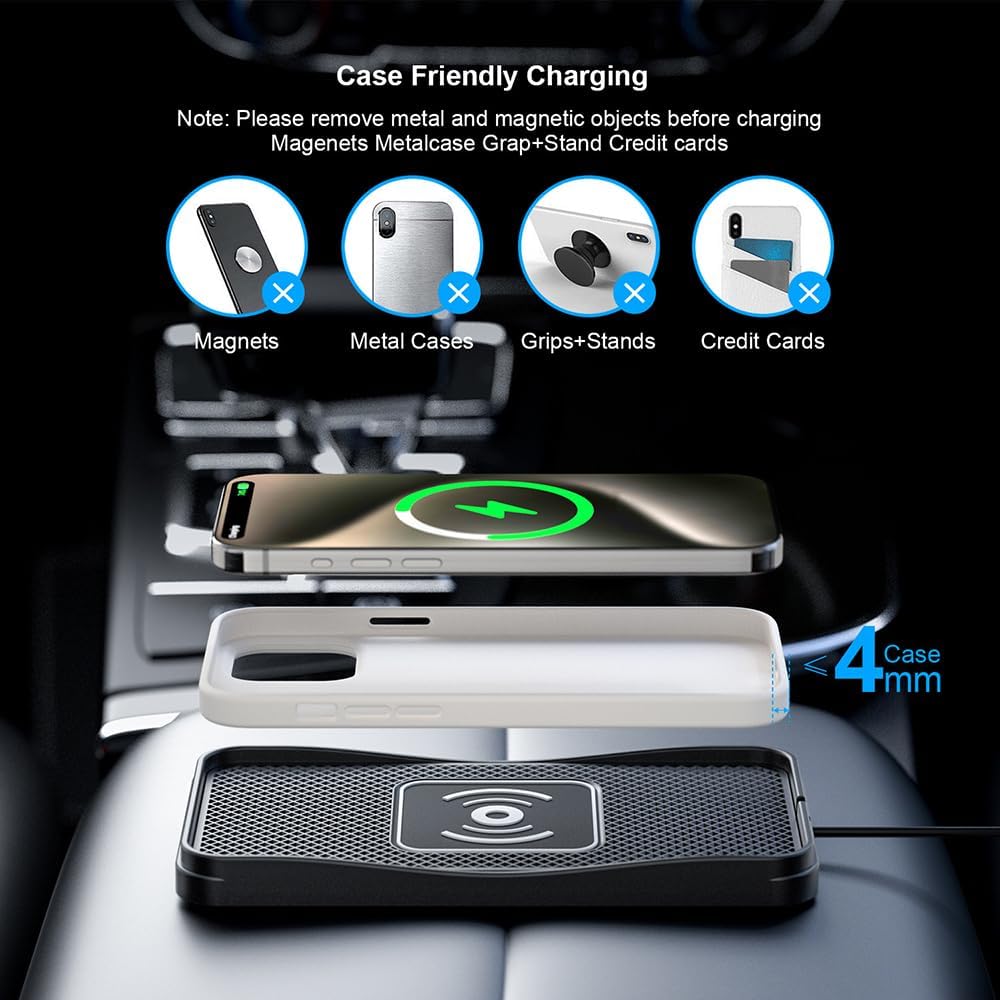【Tidy & Portable】Wireless charging reduces cable tangles and frequent plugging and unplugging, keeping the center console and storage areas clean and organized. Simply place the charger in the car and recover it when you leave, creating a cleaner and more comfortable environment for your daily commutes and long journeys.