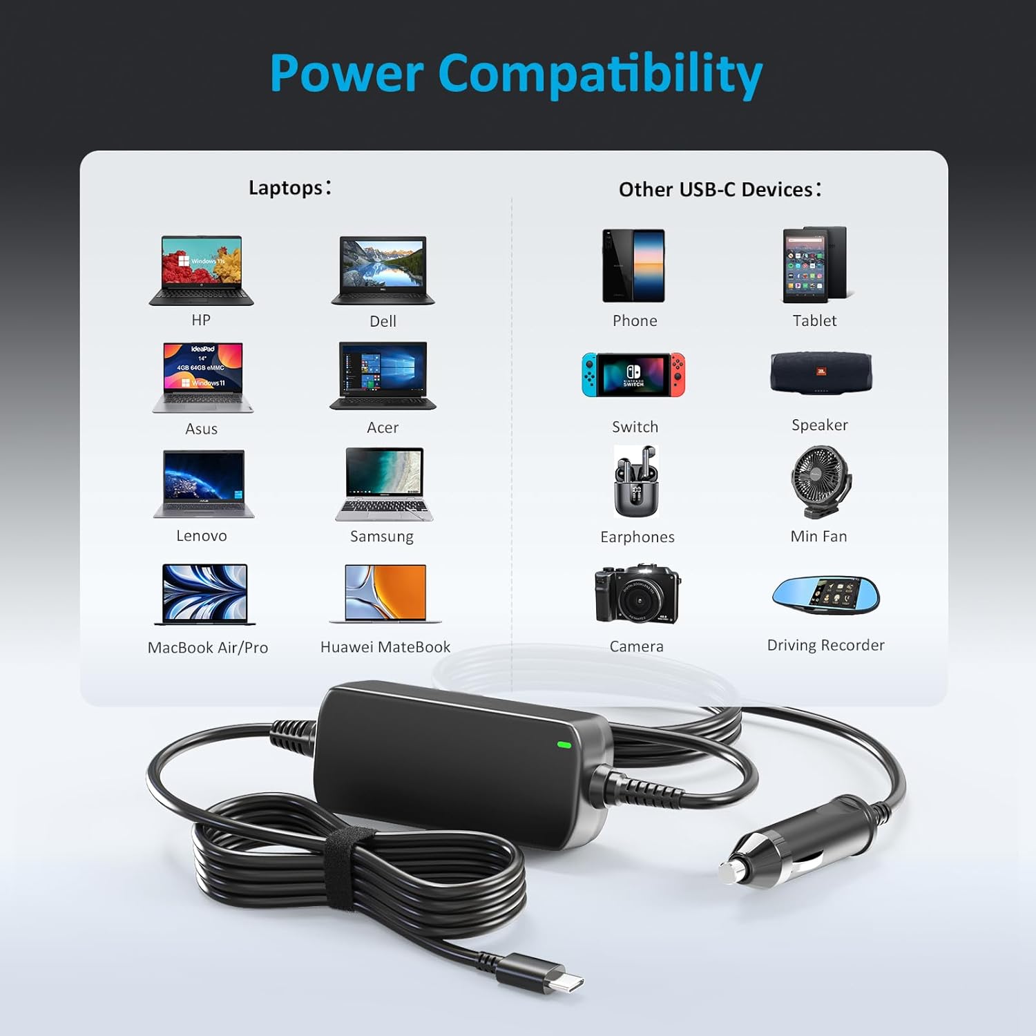 This 12-24V DC adapter for 100W, 90W, 65W, 45W laptop is designed with USB Type C plugs and will be a good replacement for your laptops, phones, tablets, headphones and more