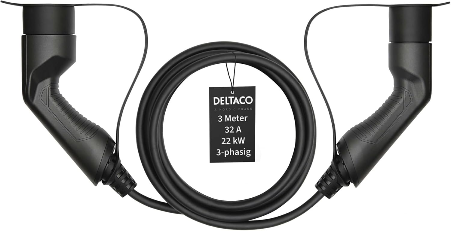 DeLTACO – Cable de carga EV/coche eléctrico, tipo 2 a tipo 2, modo de carga 3, trifásico, intensidad 32 A, potencia 22 KW, norma IEC 62196-2, negro