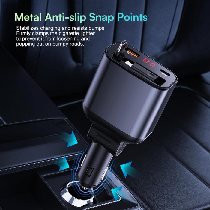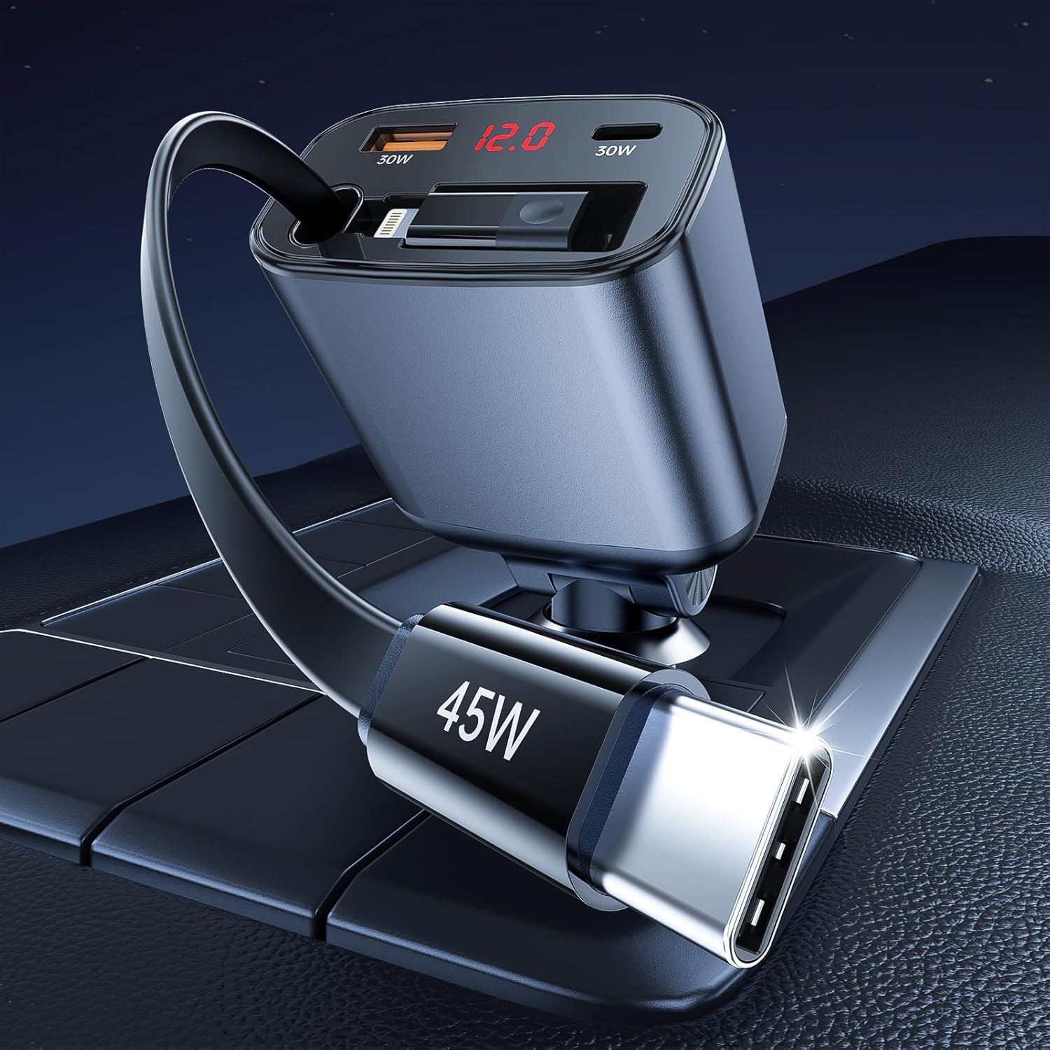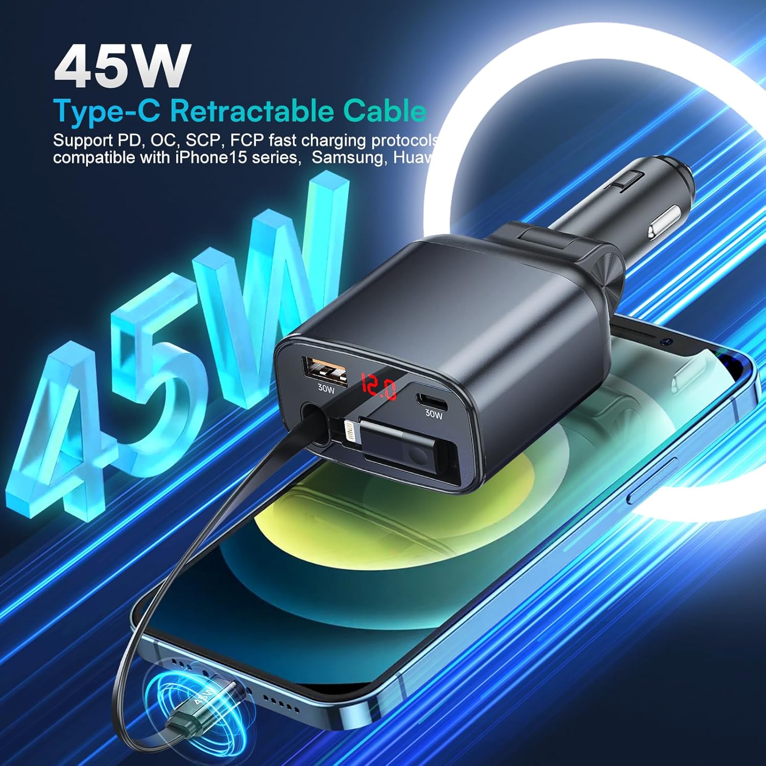 105W USB Cigarette Lighter Charger Fast Charging, 45W Retractable Car Charger, 30W QC3.0 Car Charger with LED Voltmeter, Compatible with iOS, Android, Samsung, Tablets and Smartphones