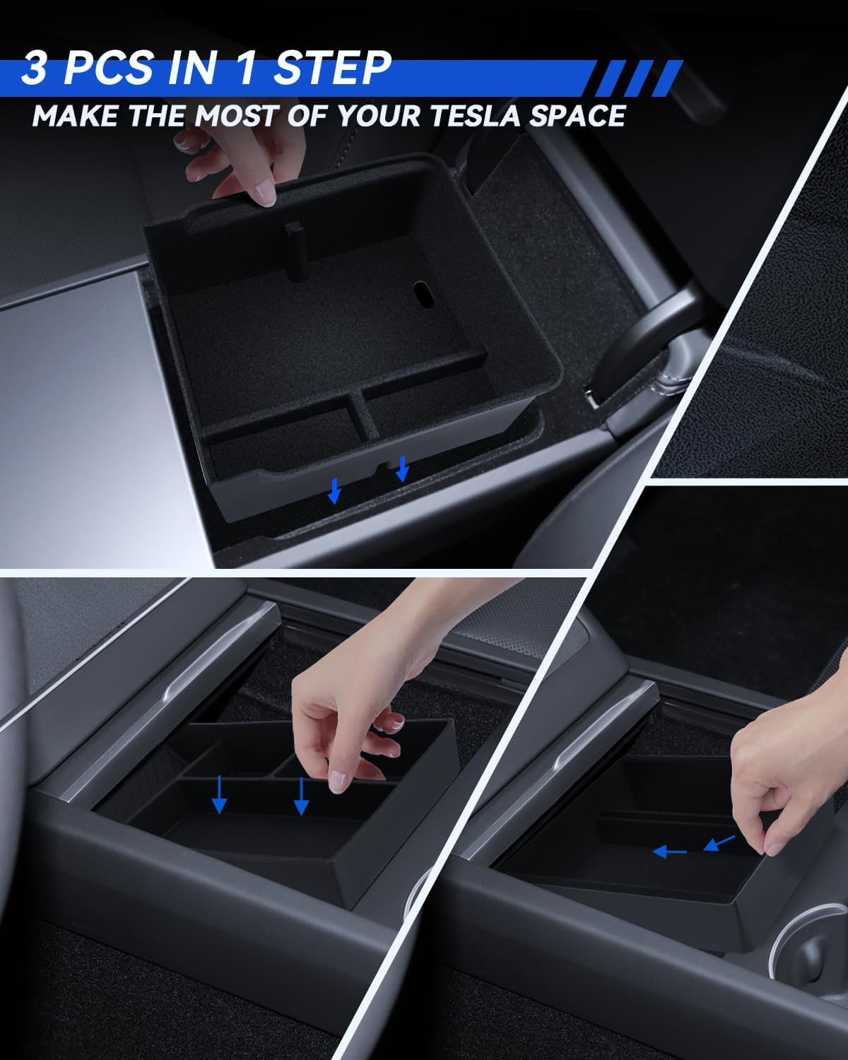 3 PIECE ACCESSORY SET: This set includes a center console organizer, silicone organizer tray, and armrest storage box. This complete 3-piece set helps you better organize your Tesla.